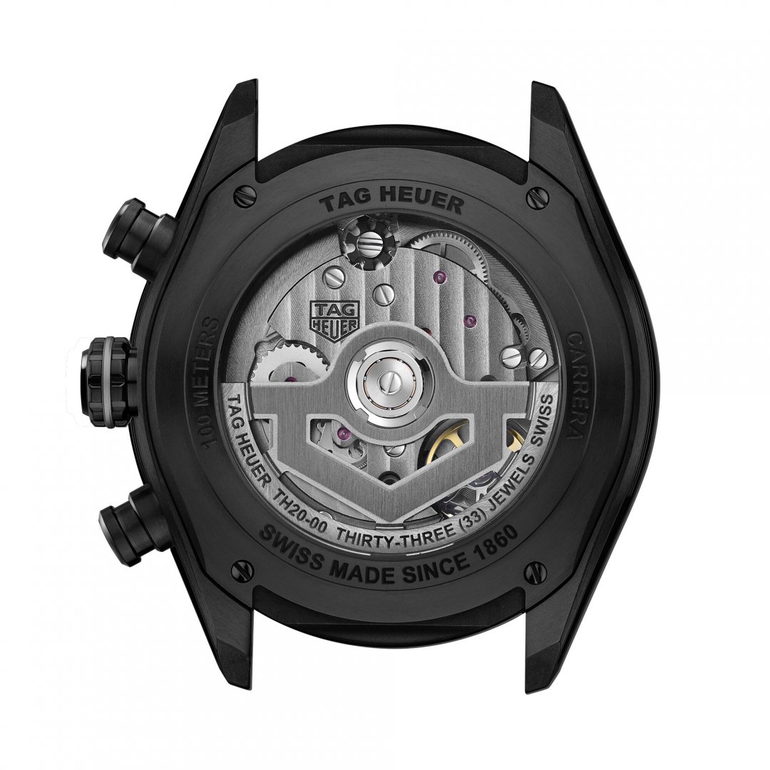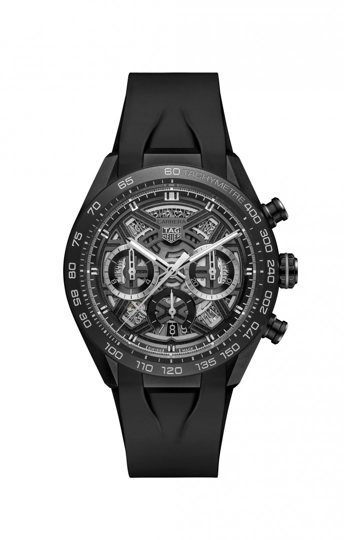 luxury watches TAG Heuer Carrera Chronograph Extreme Sport In-House movement TH20-00, 44 mm. The watch has functions luminescence, stopwatch, Tachymeter scale, date and dual time. Basic parameters of the watch are: dial colour is transparent and black, movement type is mechanical chronograph with automatic winding, strap material is rubber and water resistance is 100 m.