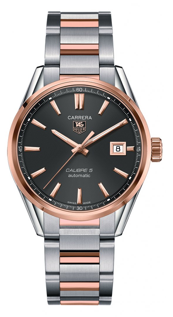 Luxury watches TAG Heuer Carrera Caliber 5, Automatic, 39 mm. The watch has functions luminescence and date . Basic parameters of the watch are: water resistent is 100 m, movement type is mechanical watch with automatic winding, dial colour is grey and strap material is steel.