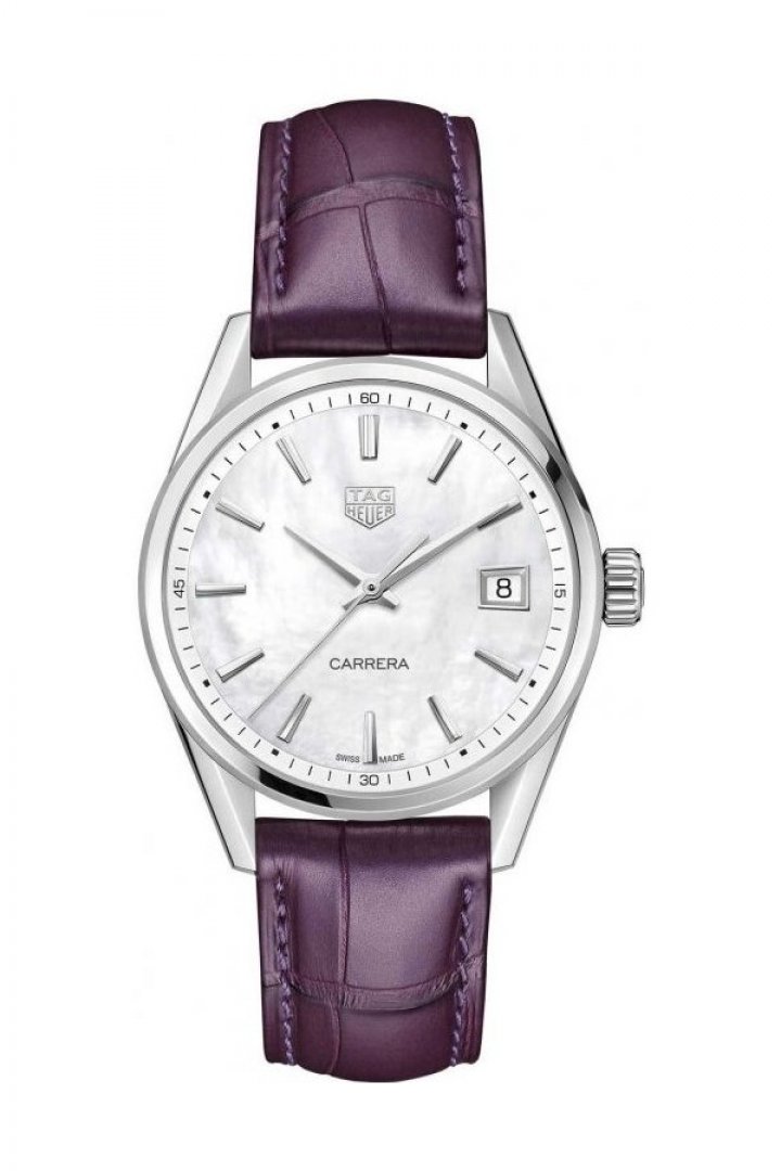 Luxury watches TAG Heuer Carrera Steel Bracelet, Quartz, 32 mm. The watch has functions date and E.O.L.. Basic parameters of the watch are: movement type is Quartz watches, water resistent is 100 m, strap material is leather and dial colour is pearl.