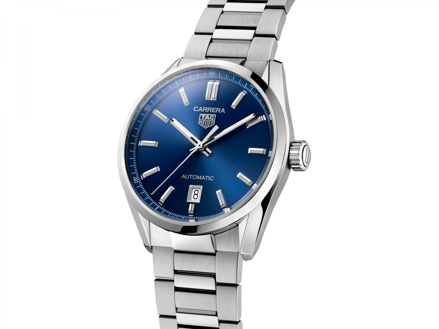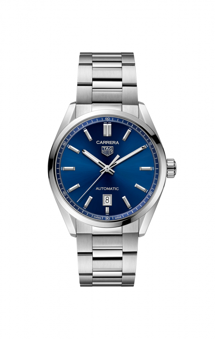 luxury watches TAG Heuer Carrera Calibre 5, Water resistance 100M, 39 mm. The watch has functions luminescence and date . Basic parameters of the watch are: movement type is mechanical watch with automatic winding, strap material is steel, water resistance is 100 m and dial colour is blue.