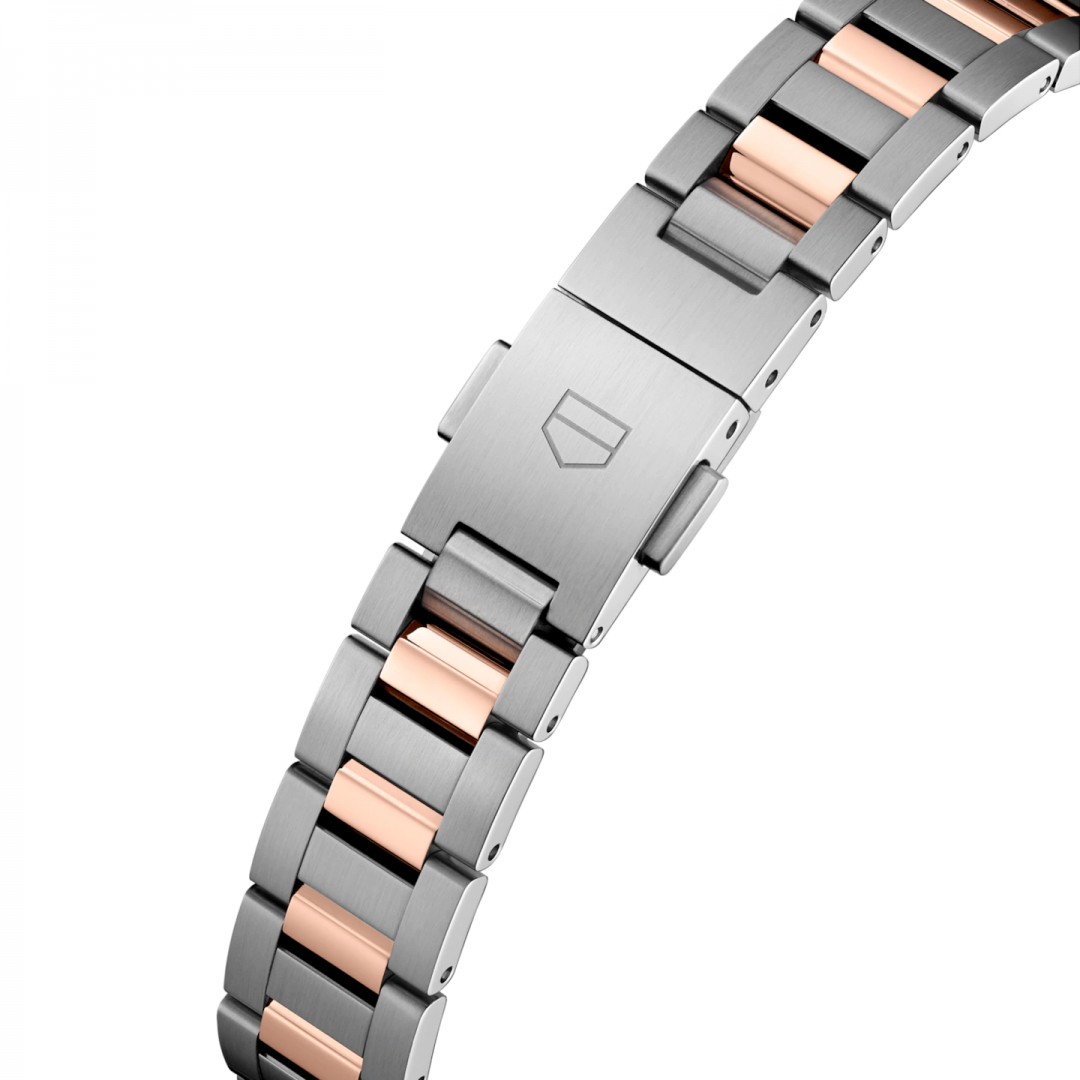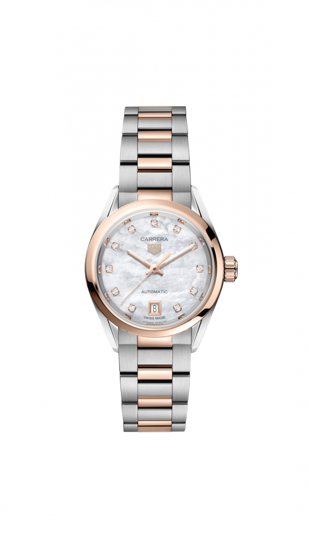 luxury watches TAG Heuer Carrera Calibre 9, waterproof 100m, 29 mm. The watch has functions date . Basic parameters of the watch are: movement type is mechanical watch with automatic winding, strap material is steel and gold, water resistance is 100 m and dial colour is pearl.