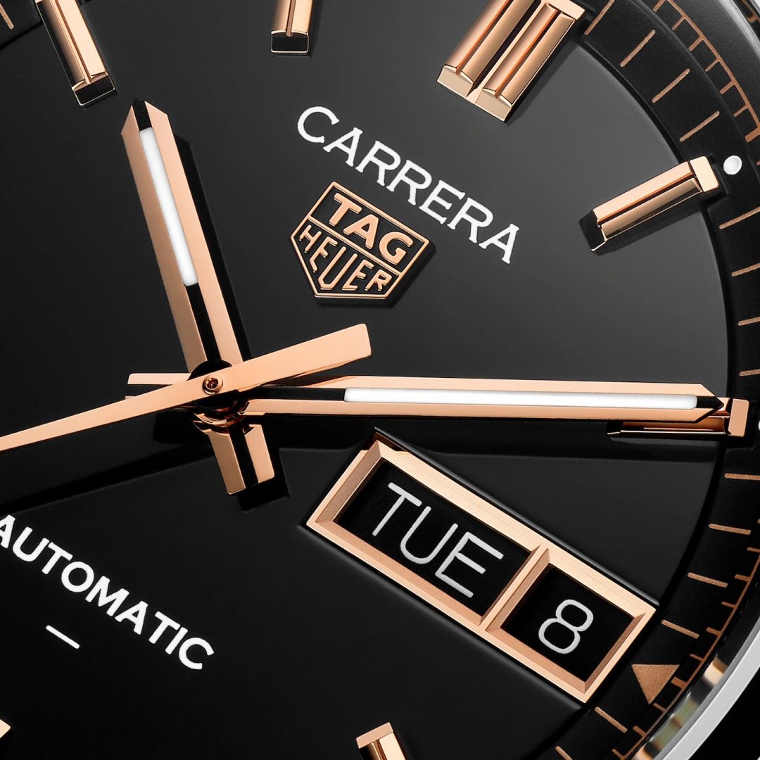 luxury watches TAG Heuer Carrera TH31-02, Water resistance 100M, 41 mm. The watch has functions luminescence, date and Day-Date. Basic parameters of the watch are: movement type is mechanical watch with automatic winding, strap material is steel, water resistance is 100 m and dial colour is black.