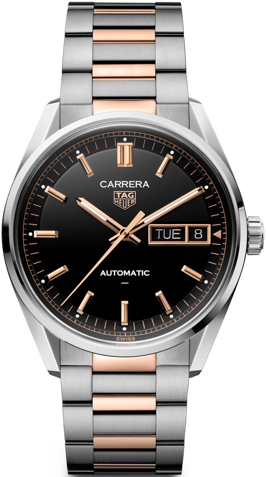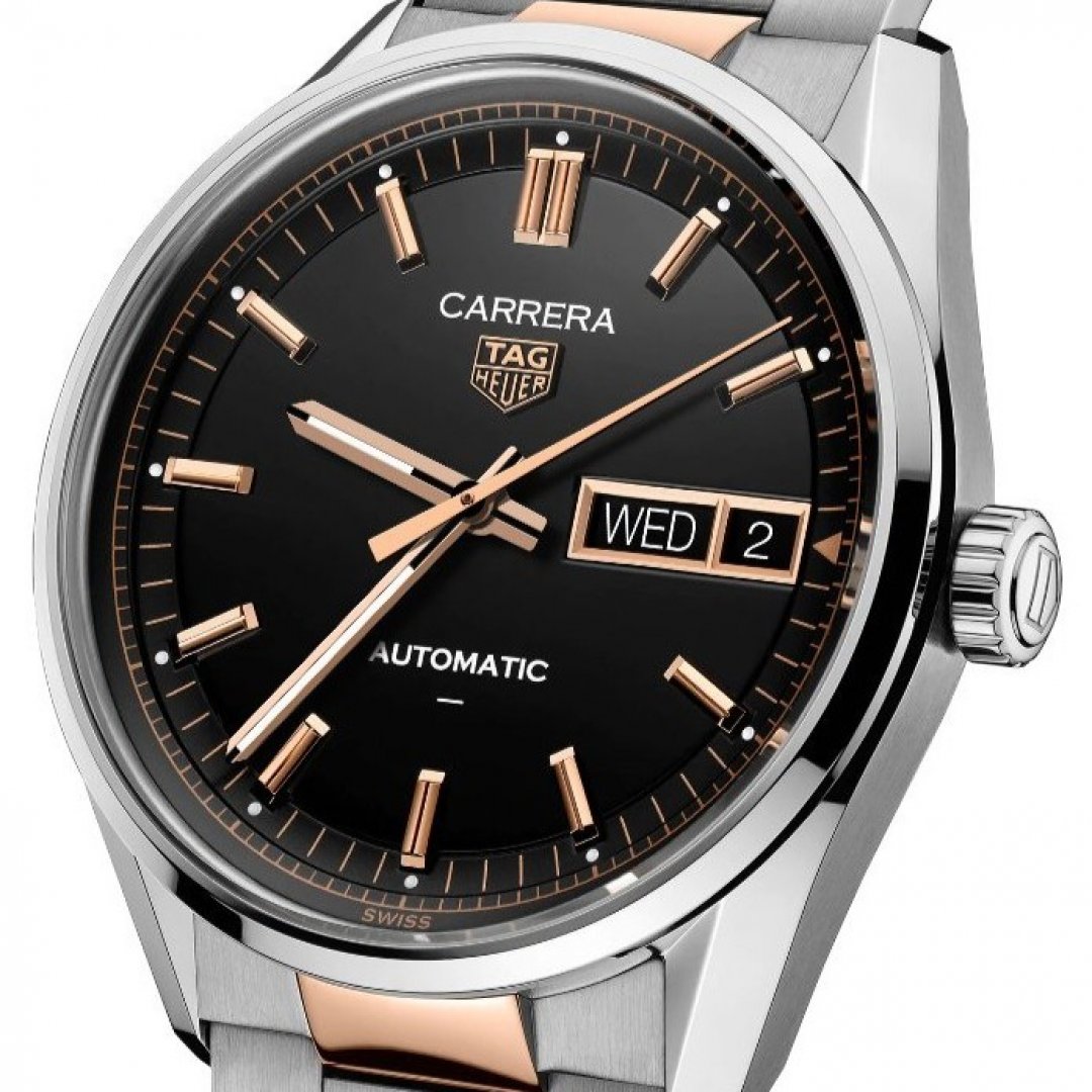 luxury watches TAG Heuer Carrera TH31-02, Gold, Water resistance 100M, 41 mm. The watch has functions luminescence, date and Day-Date. Basic parameters of the watch are: movement type is mechanical watch with automatic winding, water resistance is 100 m, dial colour is black and strap material is steel and gold.