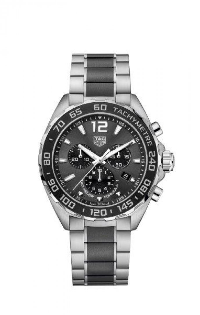 Luxury watches TAG Heuer Formula 1 Ceramic Bracelet, Quartz Chronograph, 43 mm. The watch has functions stopwatch, Tachymeter scale and date . Basic parameters of the watch are: dial colour is grey, movement type is Quartz chronograph, strap material is ceramics and steel and water resistent is 200 m.
