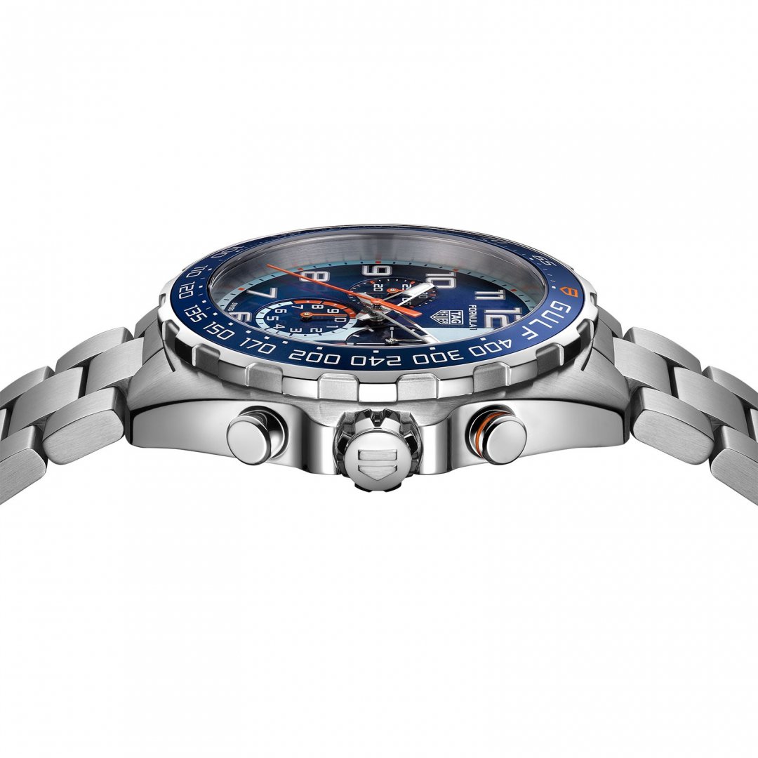 luxury watches TAG Heuer Formula 1 Quartz, Chronograph, Gulf, 43 mm. The watch has functions luminescence, stopwatch, Tachymeter scale and date . Basic parameters of the watch are: movement type is Quartz chronograph, water resistance is 200 m, dial colour is blue and strap material is steel.
