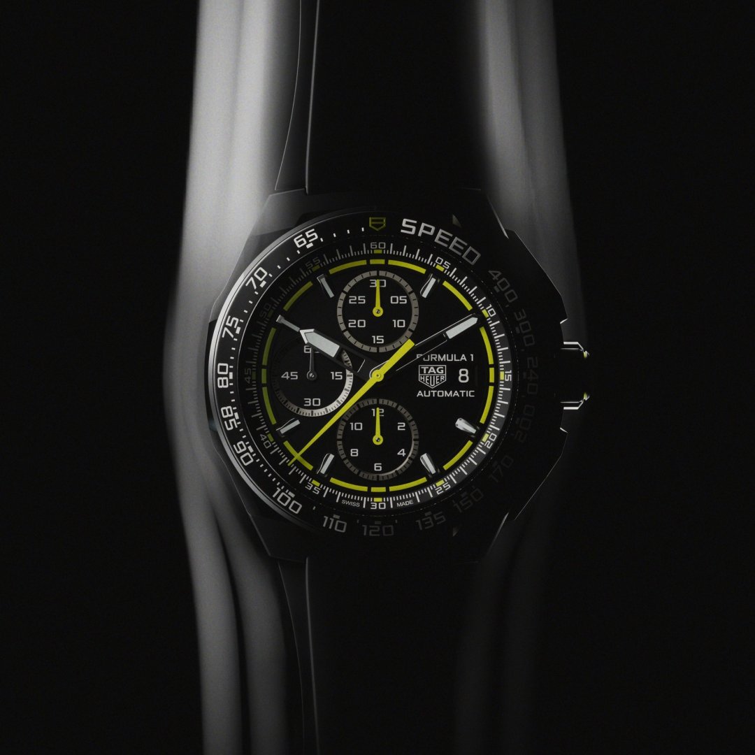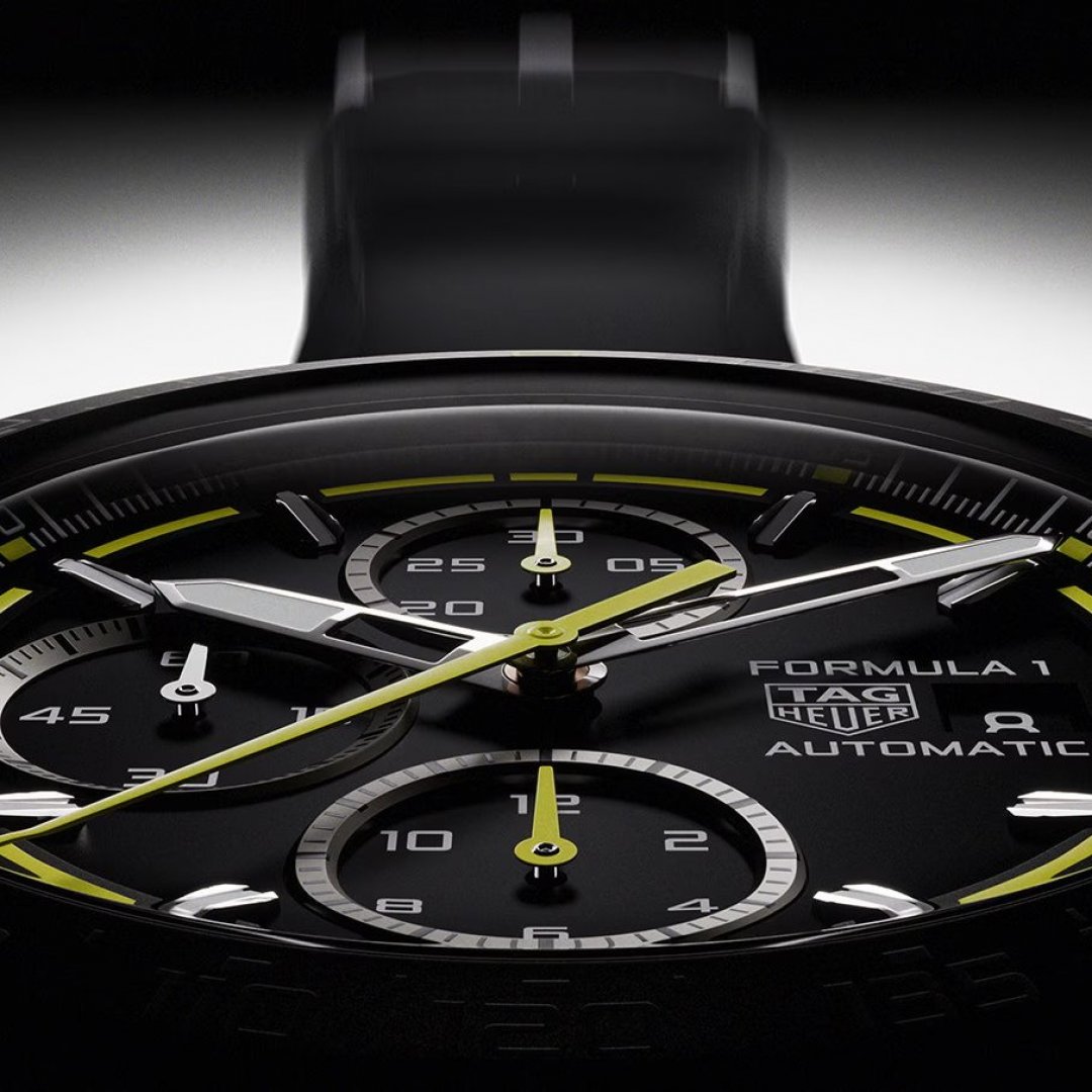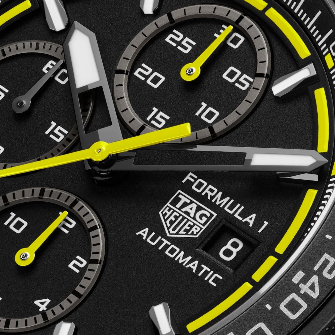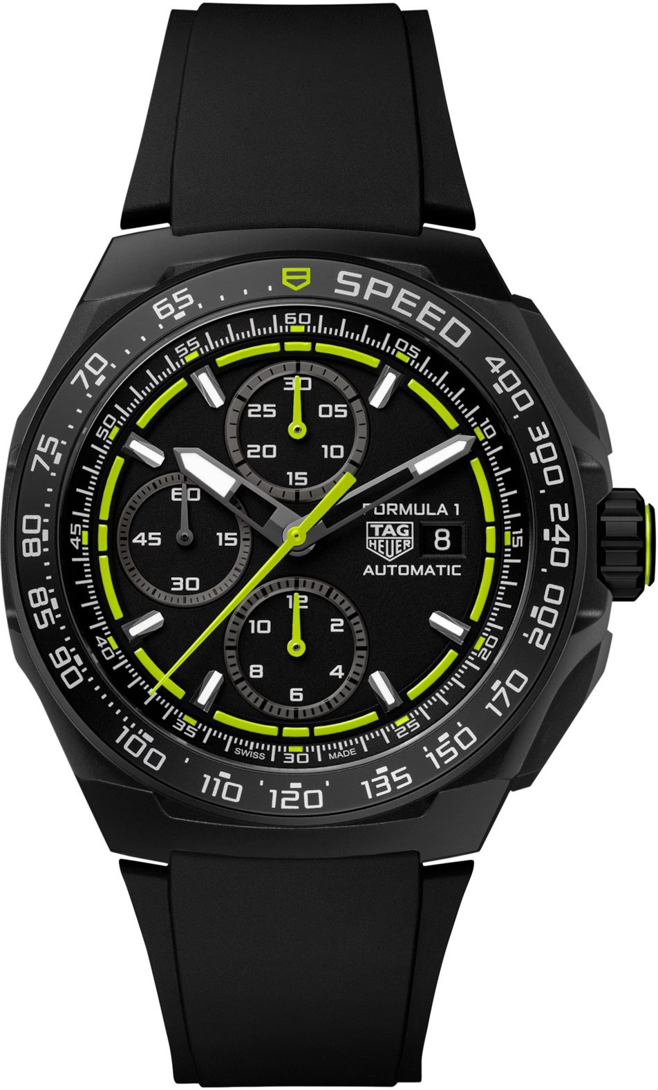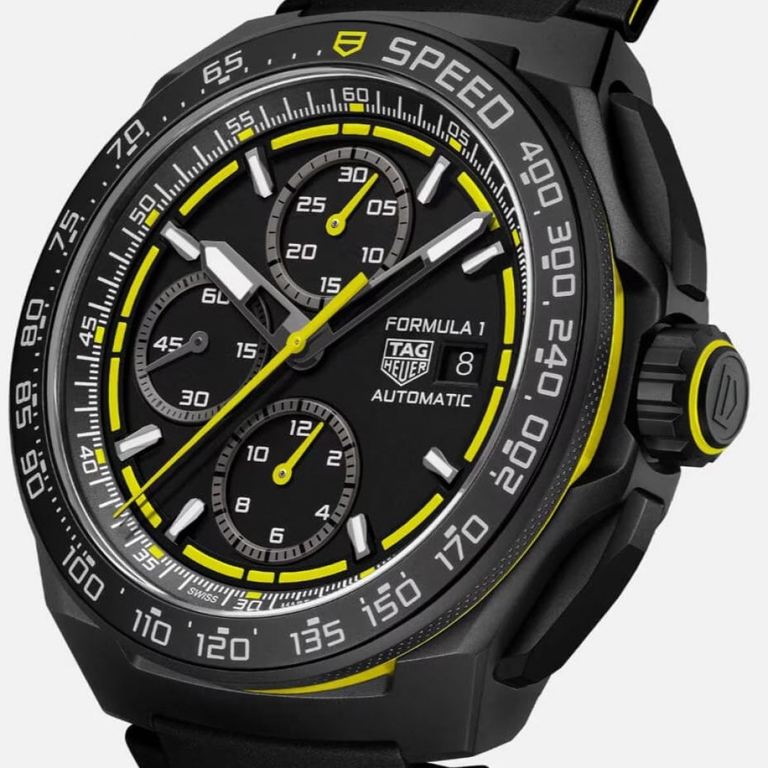 luxury watches TAG Heuer Formula 1 Automatic Chronograph, Water resist. 200M, 44 mm. The watch has functions luminescence, stopwatch, Tachymeter scale and date . Basic parameters of the watch are: movement type is mechanical chronograph with automatic winding, strap material is rubber, water resistance is 200 m and dial colour is black and yelow.