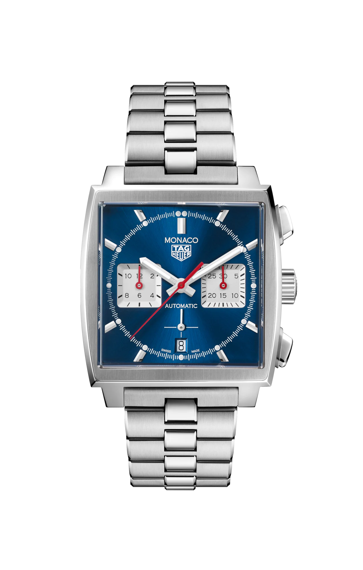 luxury watches TAG Heuer Monaco HEUER 02, Water resistance 100M, 39 mm. The watch has functions luminescence, stopwatch and date . Basic parameters of the watch are: movement type is mechanical chronograph with automatic winding, water resistance is 100 m, strap material is steel and dial colour is blue.