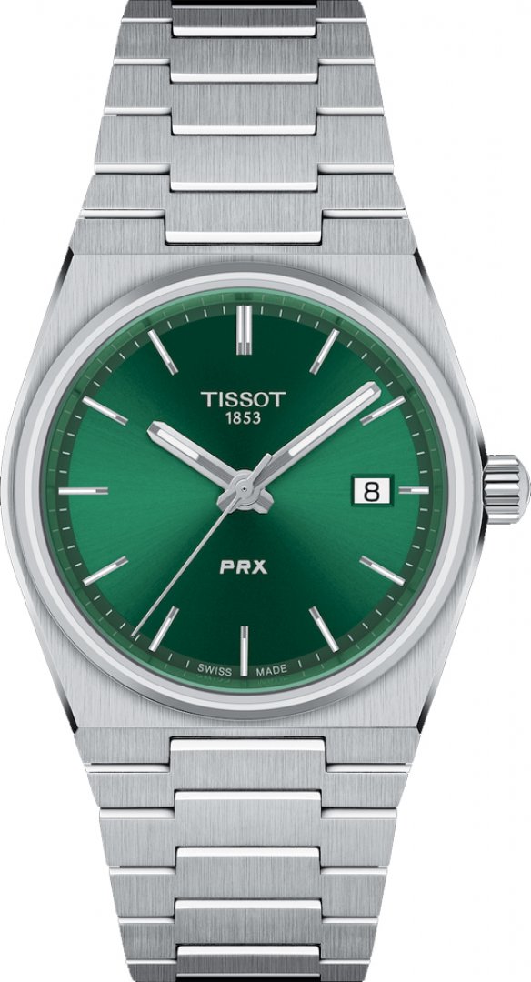 luxury watches Tissot PRX Quartz, Water resistance 100M, 35 mm. The watch has functions date . Basic parameters of the watch are: movement type is Quartz watches, water resistance is 100 m, strap material is steel and dial colour is green.