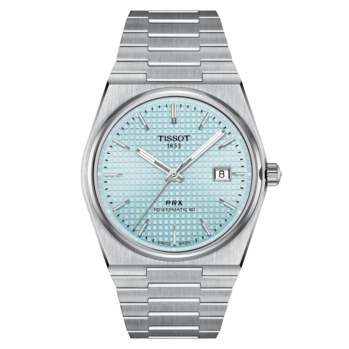 Men's luxury watches Tissot PRX POWERMATIC 80 40mm stainless steel case with steel buckle. The watch has functions date and luminescence. Basic parameters of the watch are: dial colour is blue, movement type is mechanical watch with automatic winding, bracelet is steel and water resistance is 100 m.