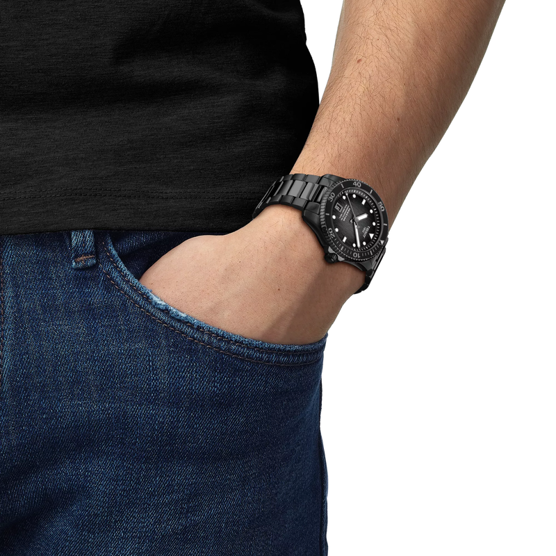 Tissot Seastar 1000 Powermatic 80 T120.807.33.051.00 je moderný potápačský model, ktorý spája technickú precíznosť, vysokú odolnosť a elegantný dizajn. Vďaka čiernemu PVD prevedeniu, gradientnému ciferníku a automatickému strojčeku s dlhou rezervou chodu pôsobí hodinky súčasne športovo aj sofistikovane.