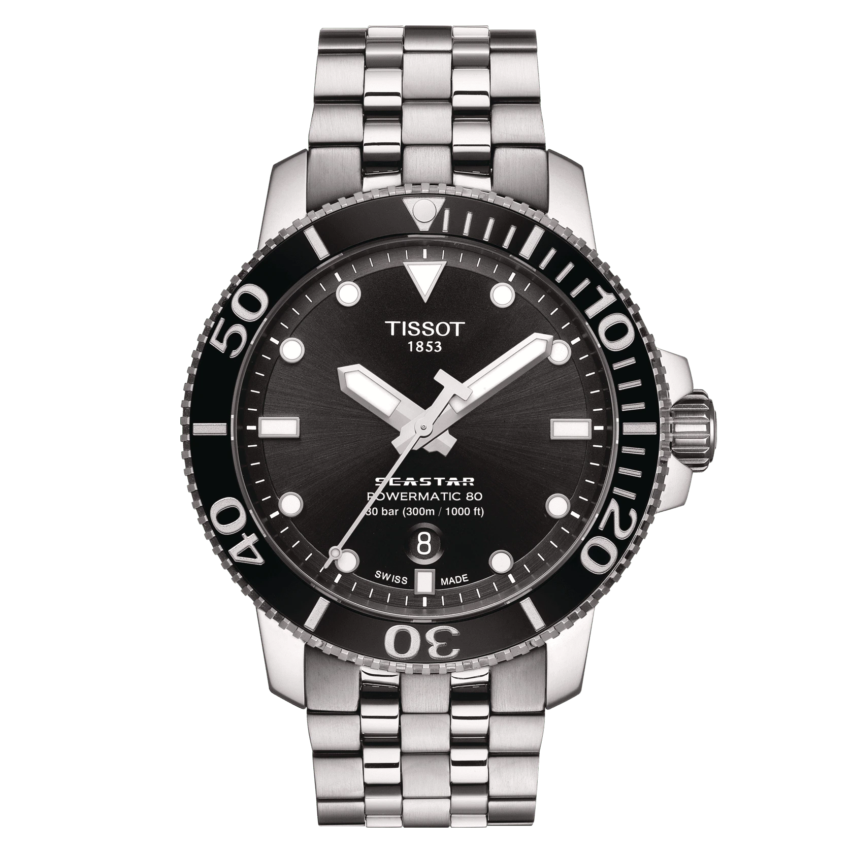 Luxury watches Tissot T-Sport Seastar, Powermatic 80, 43 mm. The watch has functions luminescence and date . Basic parameters of the watch are: strap material is steel, dial colour is black, movement type is mechanical watch with automatic winding and water resistent is 300 m.