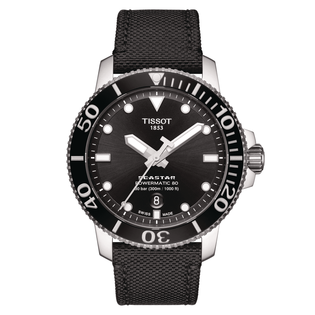 Men's luxury watches Tissot SEASTAR 1000 POWERMATIC 80 43mm steel case with rubber strap.