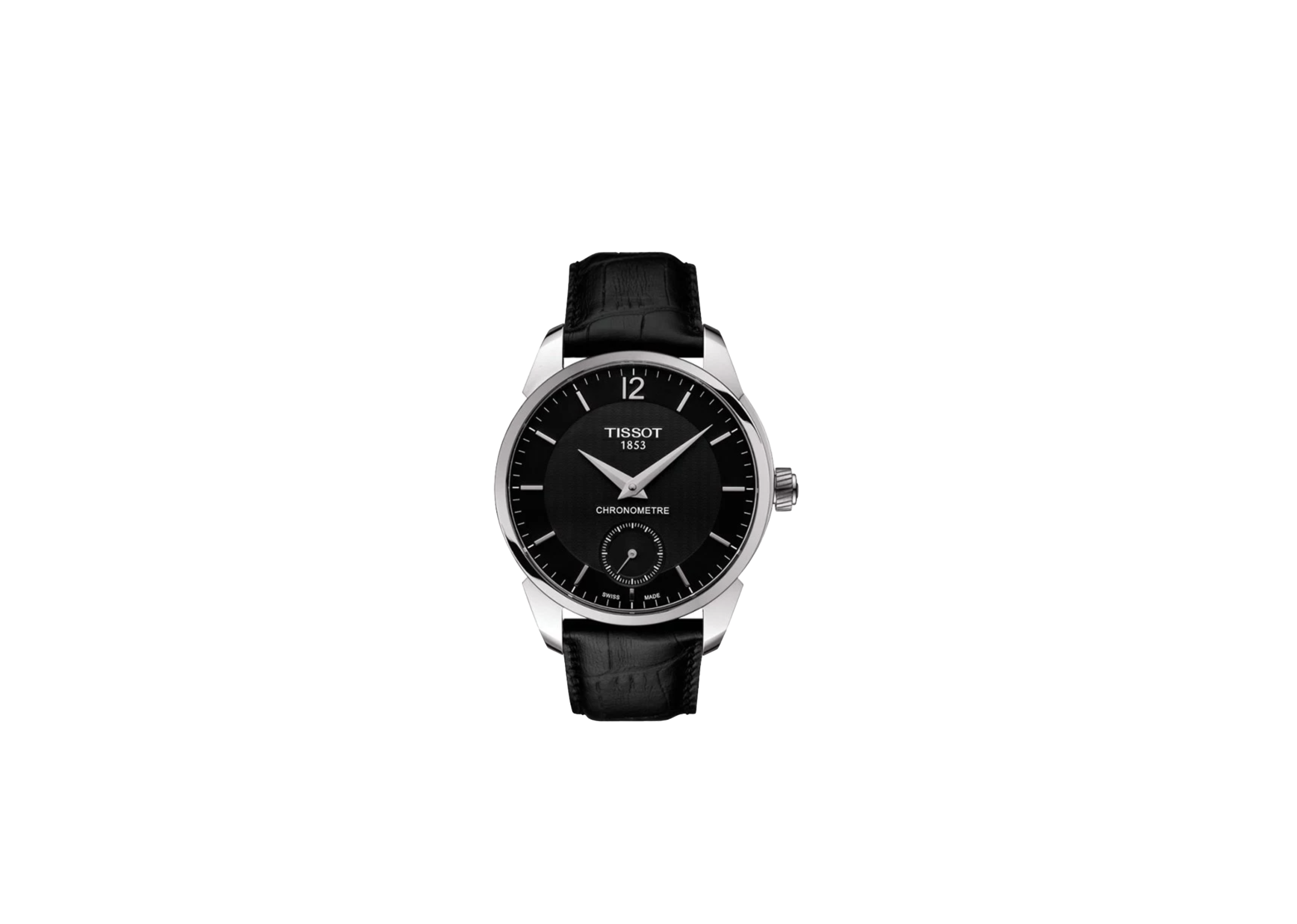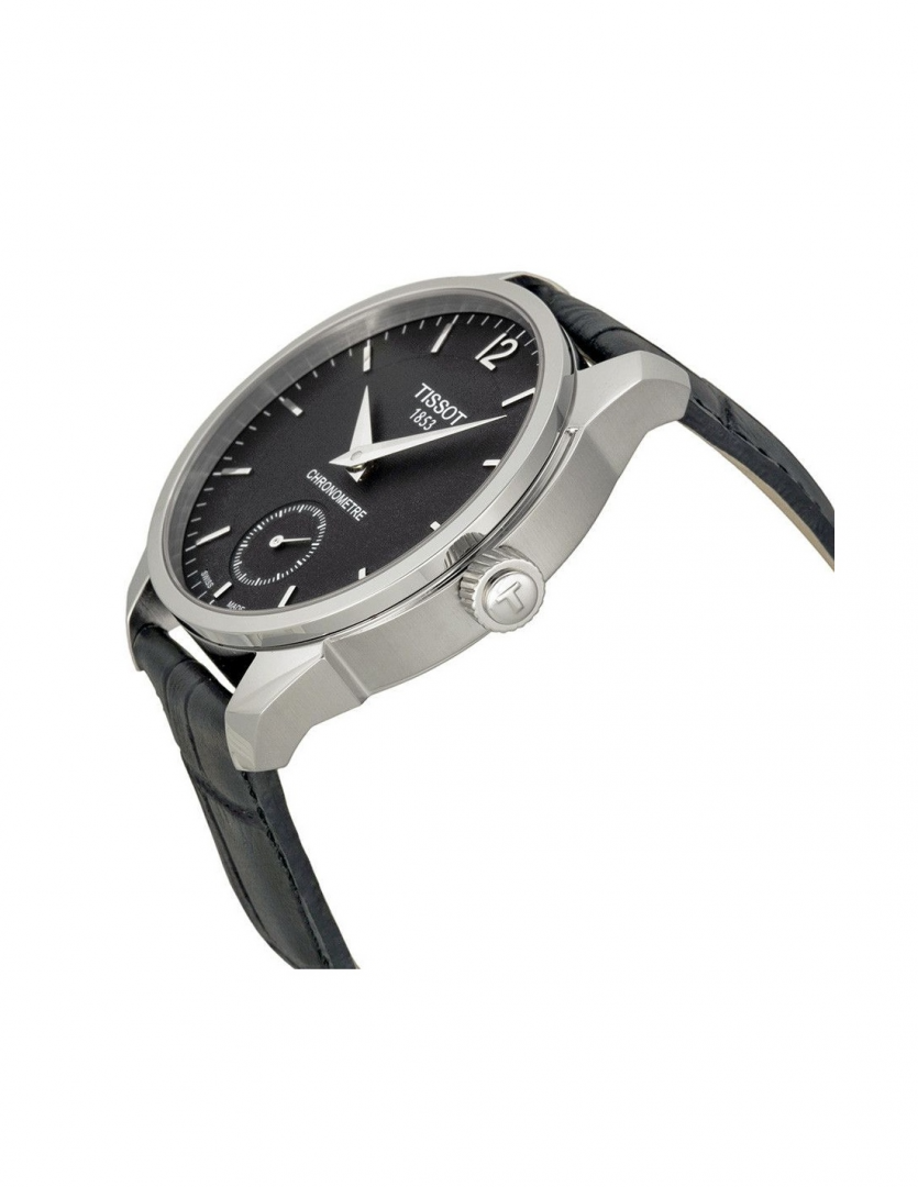 Men's luxury watches Tissot T-Classic 43mm steel case leather strap. The watch has functions luminescence, stopwatch, Tachymeter scale and date . Basic parameters of the watch are: dial colour is black, water resistance is 100 m, bracelet is leather and movement type is mechanical chronograph with automatic winding.