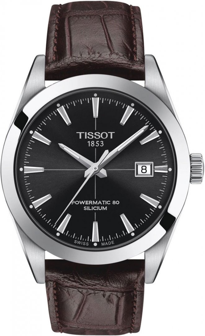 luxury watches Tissot T-Sport GENTLEMAN SILICIUM Powermatic 80, Water resistance 100M 41 mm. The watch has functions luminescence and date . Basic parameters of the watch are: movement type is mechanical watch with automatic winding, strap material is steel and leather, water resistance is 100 m and dial colour is black.