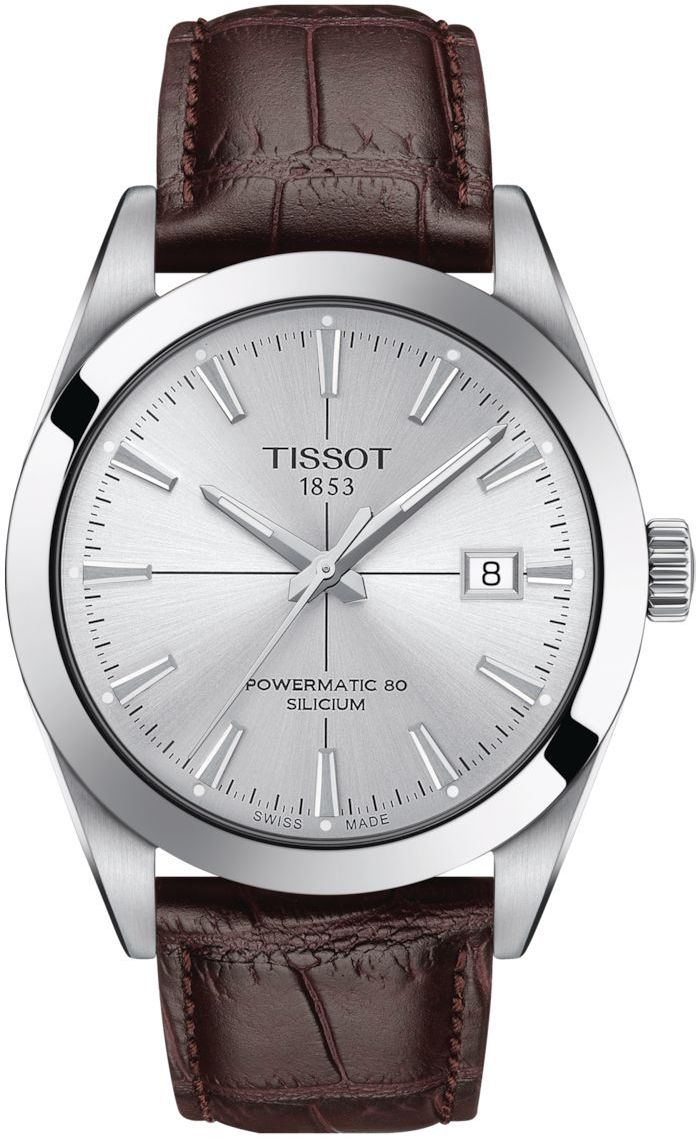 Tissot GENTLEMAN POWERMATIC 80 SILICIUM 40mmac steel case with leather strap.