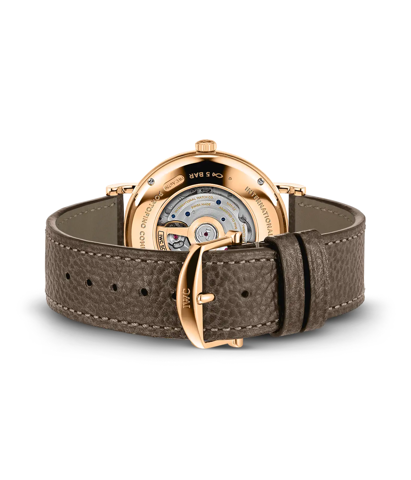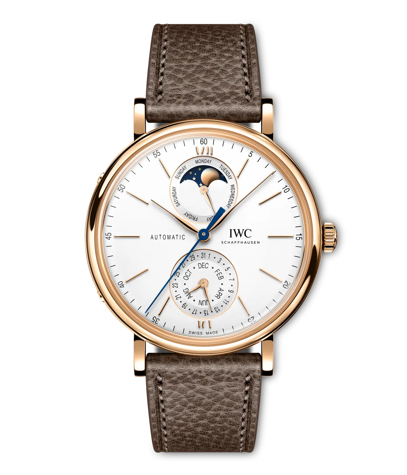 A Portofino Complete Calendar IW359002 az első IWC óra, amely az újonnan kifejlesztett teljes naptármodullal rendelkezik, amely harmonikus elrendezésben jeleníti meg a dátumot, a napot, a hónapot és a holdfázist. Ez a modell úgy lett kialakítva, hogy maximális funkcionalitást biztosítson, miközben megőrzi a Portofino kollekcióra jellemző letisztult esztétikát.