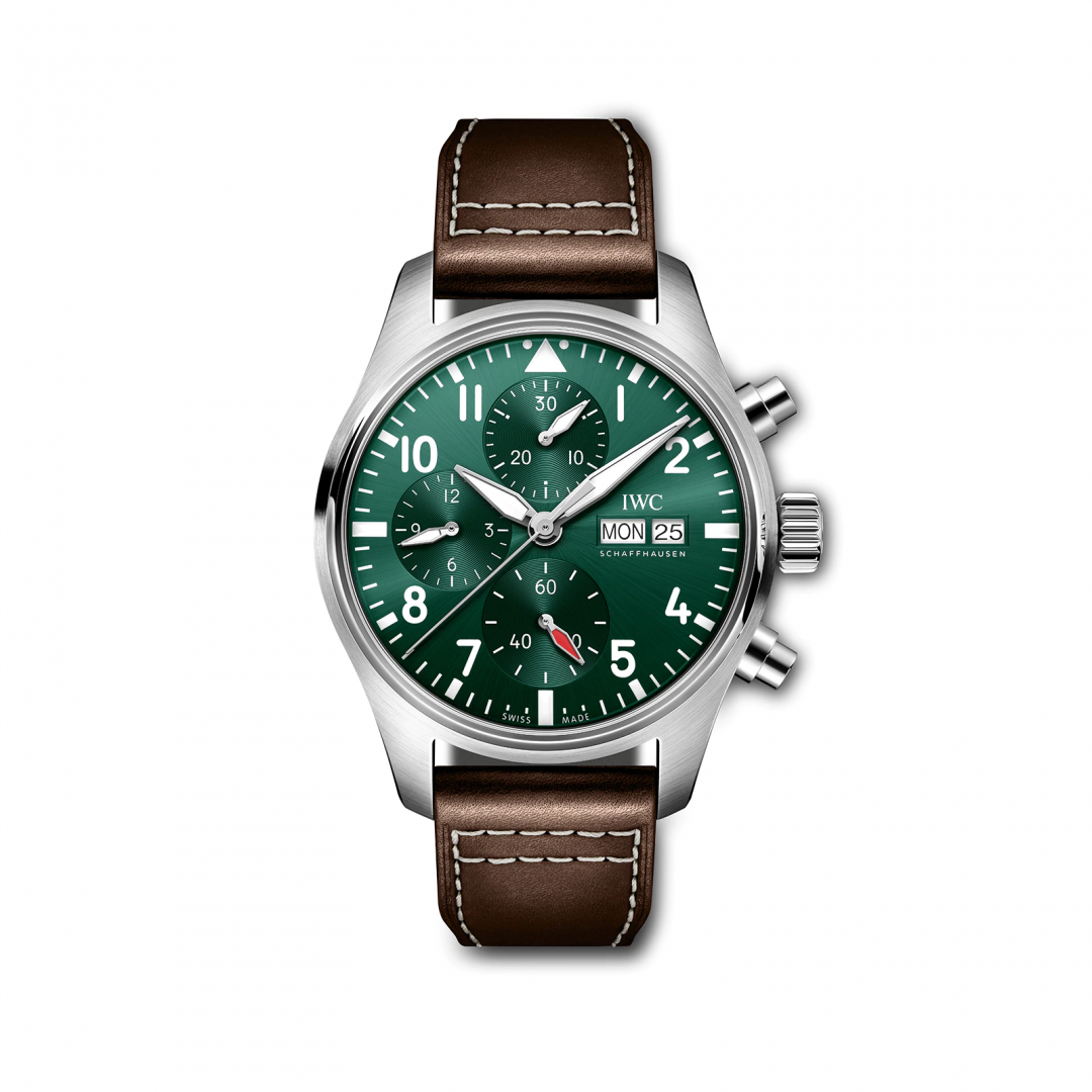 Férfi órák luxus órák luxus karórák webshopja IWC Schaffhausen Pilot 's Watch 41mm, Pilot chronograph, acél tok, zöld számlap. Az óra ezen funkciókkal rendelkezik: naptár, stopper, Day-Date. Számlap színe: zöld, vízállóság: 100 m, szerkezet típusa: mechanikus kronográf automata felhúzással, szíj anyaga: bőr.
