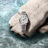 A kollekció két további modellje, a fekete és a kék lakk számlapos változat most először párosul színben harmonizáló, strapabíró gumiszíjjal. Ezek a szíjak a sportos megjelenést és a kényelmes viseletet ötvözik. A szíjak egy robusztus búvárcsattal záródnak, amely minden helyzetben biztonságos tartást nyújtanak. A fehér számlapos változatot egy rendkívül kényelmes, apró szemes, úgynevezett „beads-of-rice” acélszíjjal szerelték fel. Ez a szíj biztonsági zárral rendelkezik és kis léptékben finomhangolható a tökéletes illeszkedés érdekében. Mindhárom modell hátlapján a kollekció védjegye, a dombornyomott búvár motívum látható.