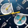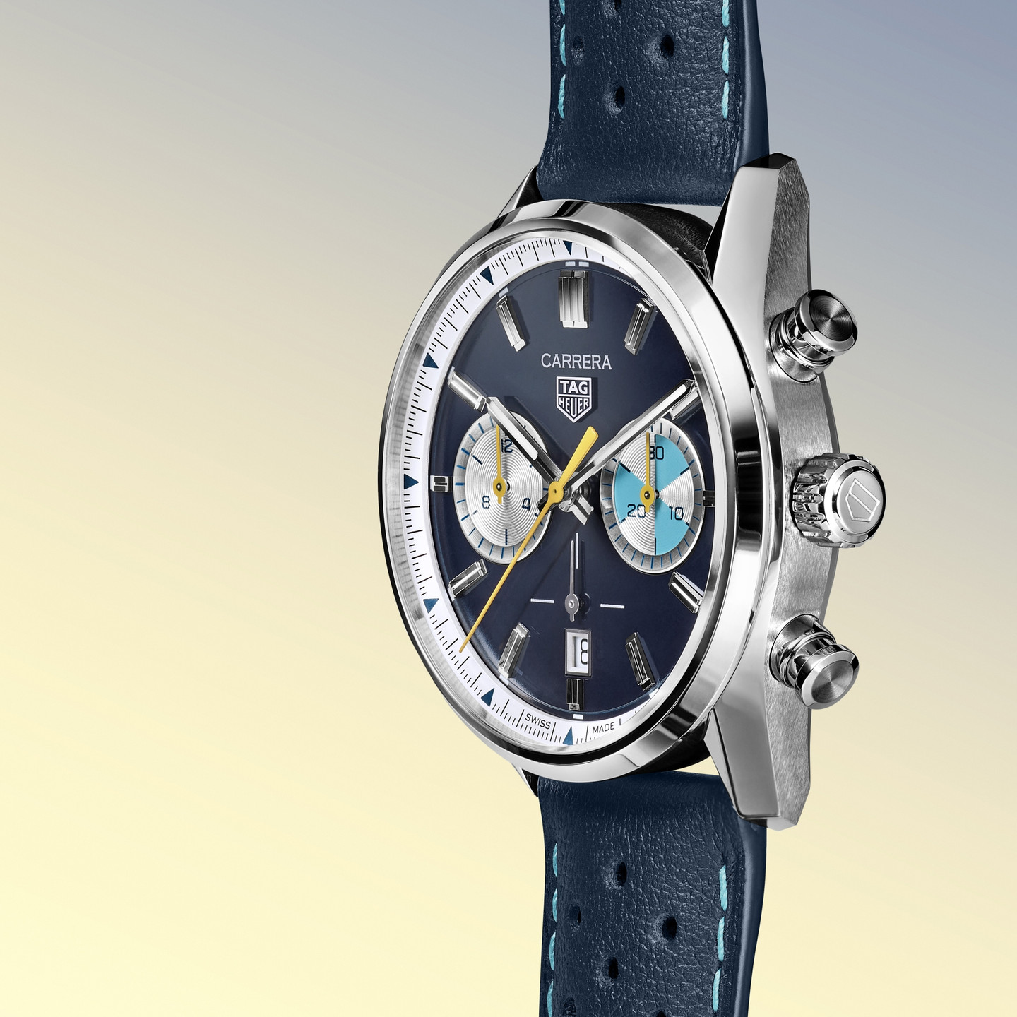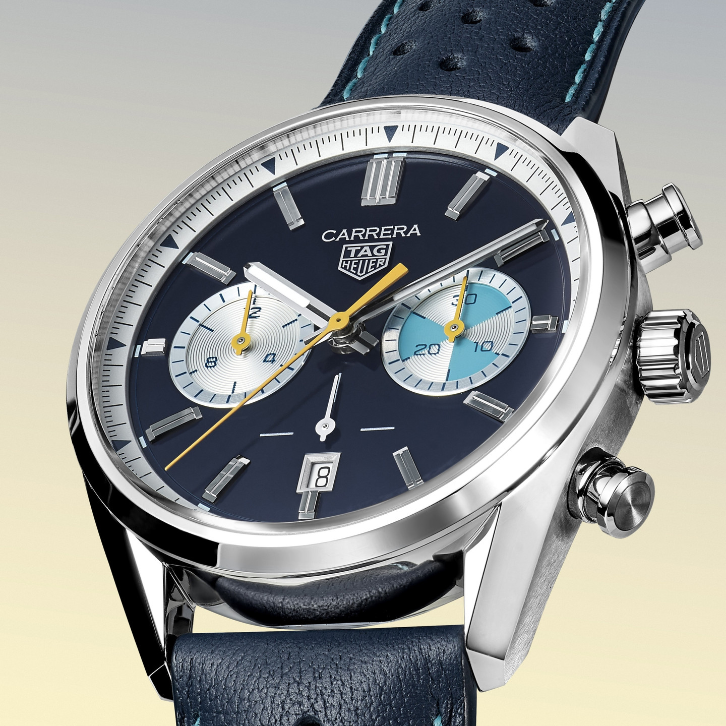 Ebben a bemutatóban a limitált kiadású összesen 500 példányban készülő Carrera kronográfra esik a rivaldafény. A kronográf egy kompromisszummentes újraértelmezése a Carrera széria hagyományának, amelyben a részletek kifinomultsága és a színvilág játékossága együtt alkot meg egy igazán karakteres karórát. A 42 milliméteres átmérőjű, rozsdamentes acéltokon egy élénk, mélykék számlappal találkozunk, amely kristálytiszta kontrasztot teremt a türkiz és élénksárga részletekkel.