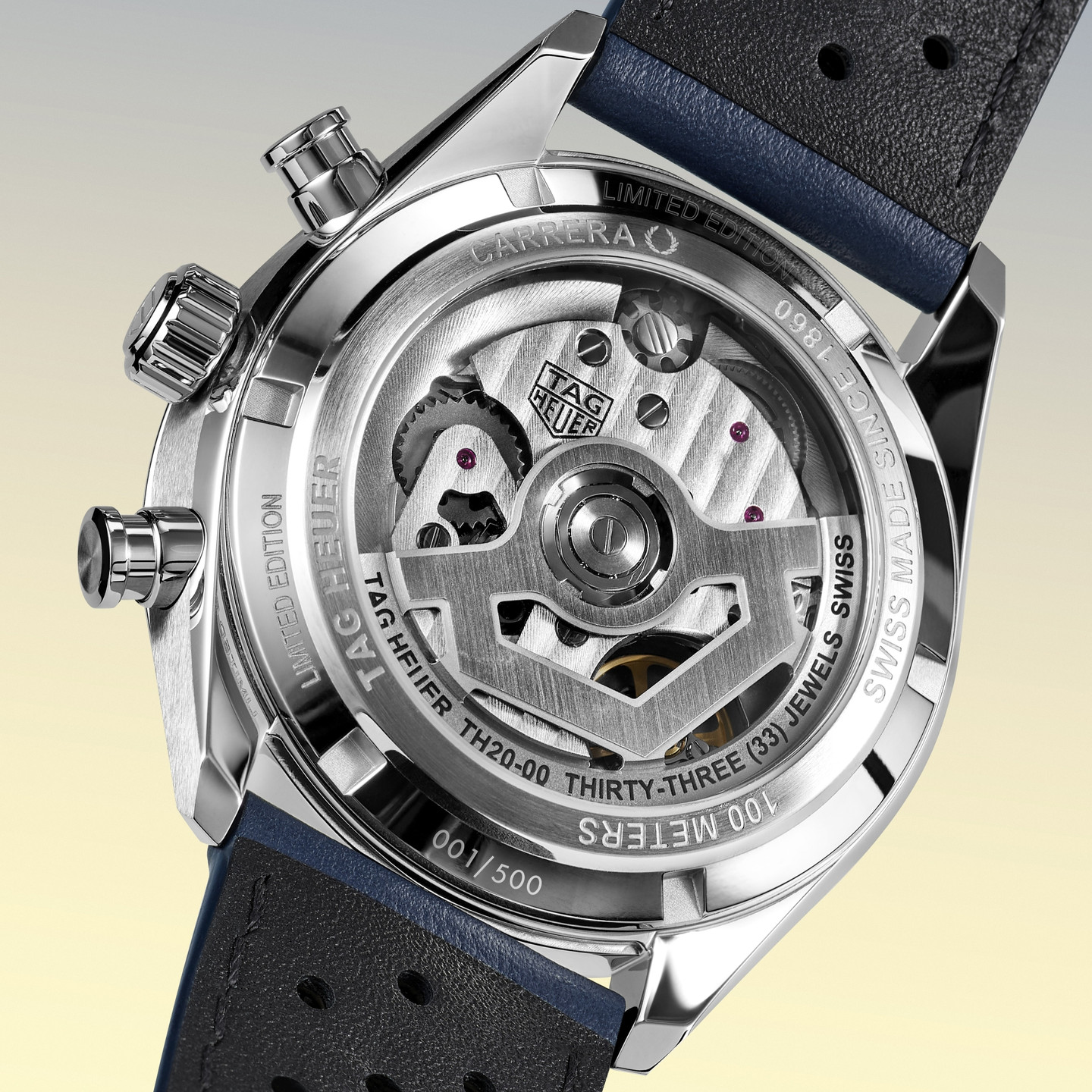 Az impozáns számlapot egy zafírkristály óraüveg védi, amit az olvashatóság érdekében tükröződésmentes bevonattal kezeltek, méghozzá mindkét oldalon. A hátlap szintén zafírkristályból készült, így betekintést enged a márka saját fejlesztésű, TH20-00 kalibereként ismert automata szerkezetének működésébe. Ez a mechanika a klasszikus órakészítés és a modern innováció színtere: leheletfinom TAG Heuer pajzs alakú lengősúllyal és akár 80 órás járástartalékával kiemelkedik a kategóriájában.