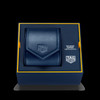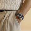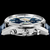 A kronográf funkciók használatára szolgáló nyomógombok kivitelezése rendkívül aprólékos: polírozott acélból készültek és formájuk tökéletesen illeszkedik a tok kontúrjaihoz, miközben használatuk egyszerű és ergonomikus. A karkötő egy perforált, élénk kék borjúbőr szíj, amely világoskék kontrasztos varrással rendelkezik, így nemcsak komfortos viseletet garantál, hanem megjelenése is felemelő.