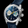 A karórán három segédszámlapot találunk. A 3 óránál és a 9 óránál megtalálható segédszámlapok a Carrera sorozat kizárólag legkiválóbb darabjain található azuré felületdíszítéssel rendelkeznek. Ez a számlapdíszítési technika finom, koncentrikus körbarázdákból áll, amelyeket a segédszámlap felületébe esztergálnak. A 3 óránál található kronográf percgyűjtő számlapja különösen figyelemfelkeltő: a türkiz és ezüst árnyalatok elegánsan egészítik ki egymást. 6 óránál helyezték el a másodpercmutatót, 9 óránál pedig az óragyűjtő számlapban gyönyörködhetünk.