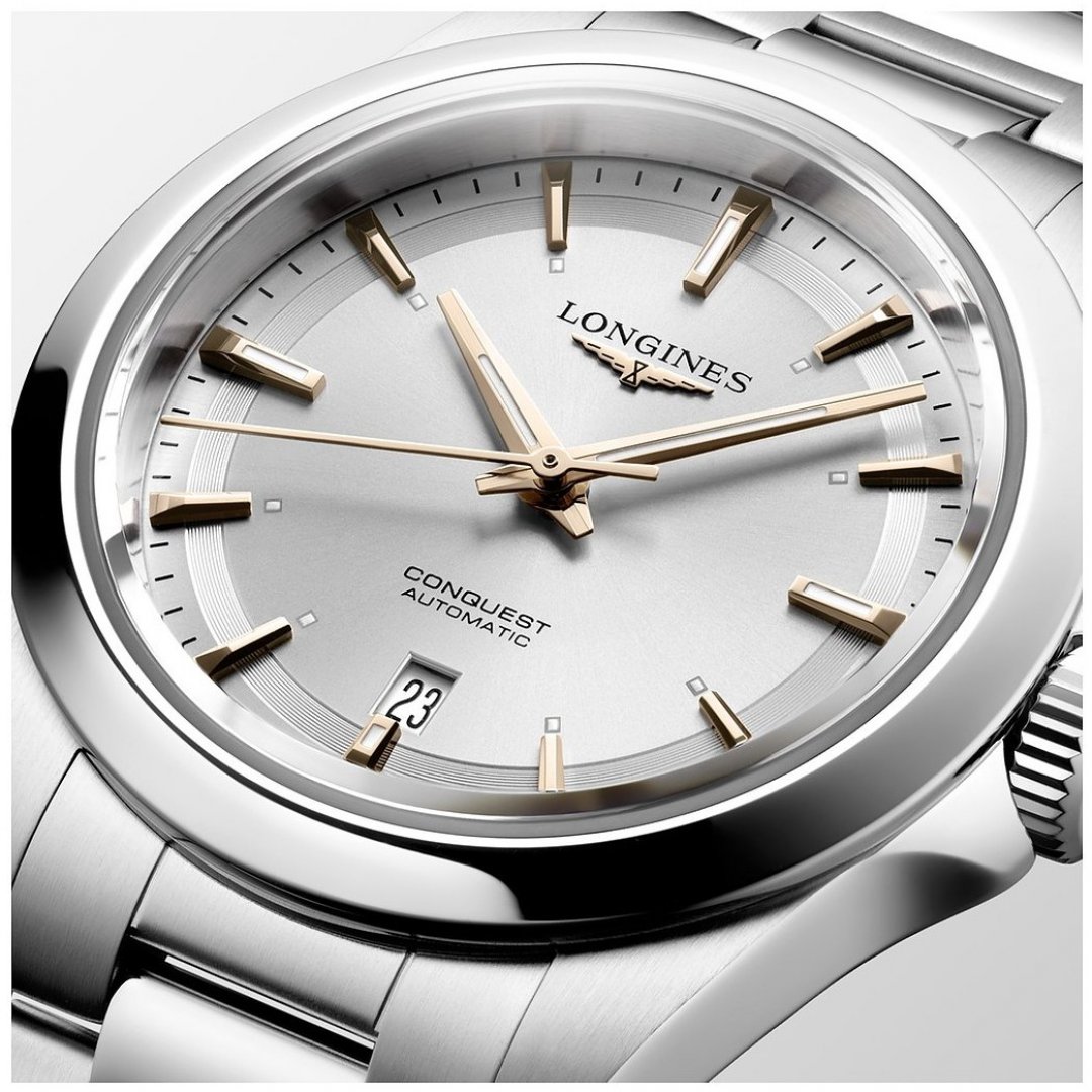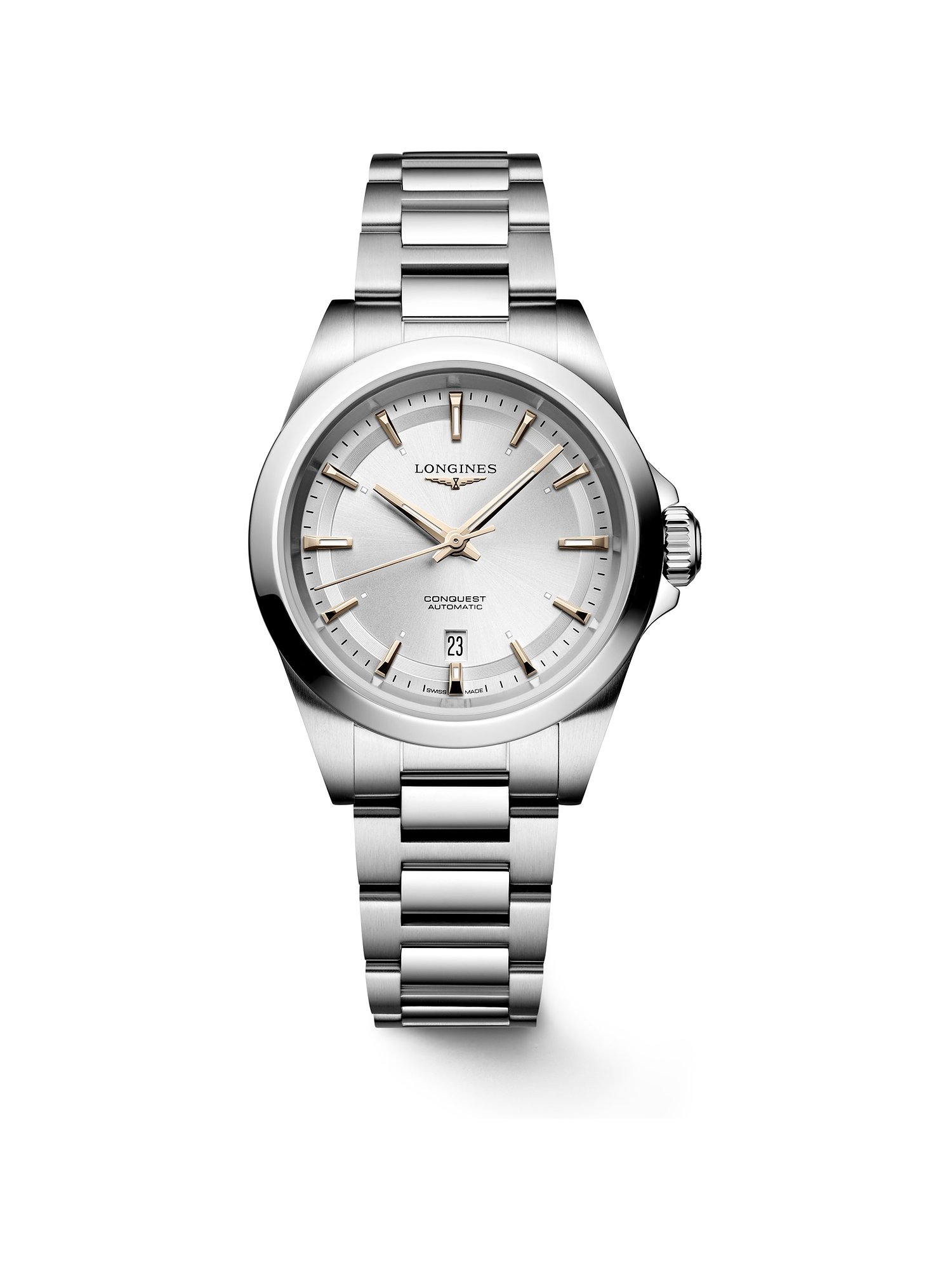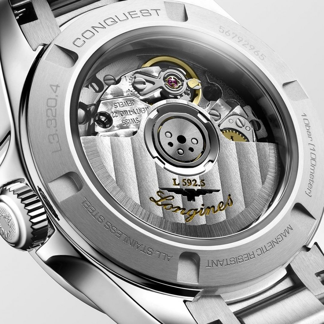 Luxusóra Longines Conquest Diamanty, Automat, vízállóság 100M, 30 mm. Az óra lumineszcens funkcióval és dátumkijelzővel rendelkezik. Az óra alapvető paraméterei: a számlap színe gyöngyház, a szíj anyaga acél, a szerkezet típusa mechanikus óra automatikus felhúzással, vízállósága 100 m.