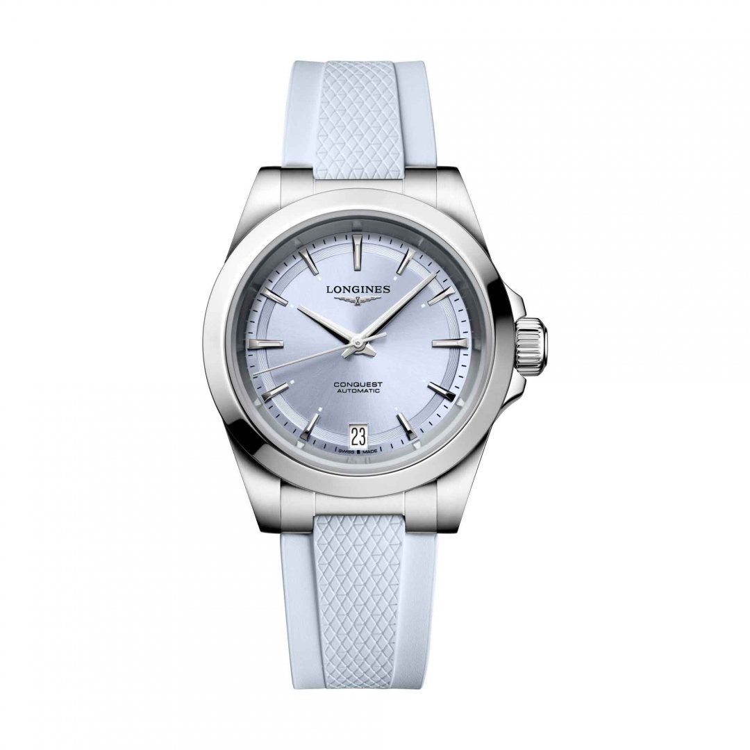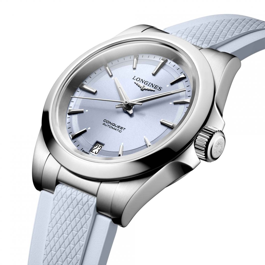 Luxusóra Longines Conquest Automat, 34 mm. Az óra dátumkijelző funkcióval rendelkezik. Az óra alapvető paraméterei: a szerkezet típusa mechanikus óra automatikus felhúzással, vízállóság 100 m, a szíj anyaga gumi, a számlap színe kék.