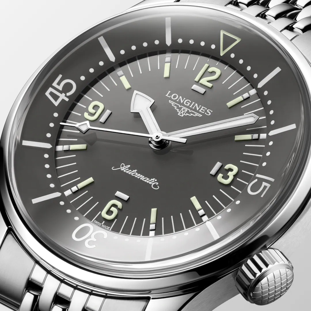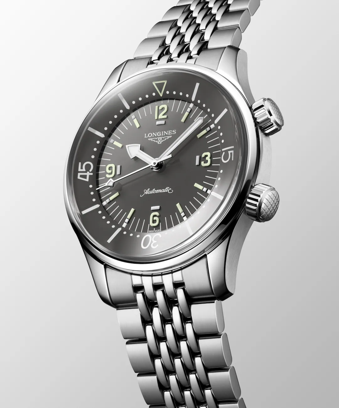 A Longines Legend Diver L3.764.4.99.6 modell az 1959-es ikonikus búváróra modern újraértelmezése. Az autentikus vintage dizájnt a legújabb Longines technológiával ötvözi, így egy időtálló eszközt hozva létre a kaland, az elegancia és a svájci precizitás szerelmeseinek. Ez a modell két koronával, belső forgó kerettel és letisztult, antracit szürke számlappal rendelkezik, amely azonnal magára vonzza a tekintetet.