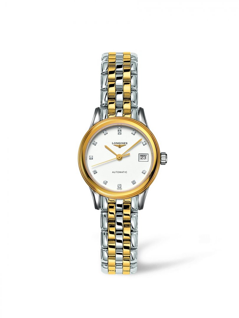 Luxus órák Longines Les Grandes Classiques de Longines Diamonds, Automatic, 26 mm. Az óra ezen funkciókkal rendelkezik: adatmutató. Számlap színe: fehér, szerkezet típusa: mechanikus óra automata felhúzással, szíj anyaga: acél, vízállóság: 30 m.