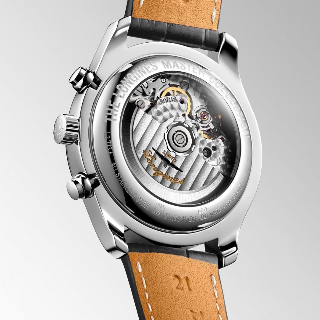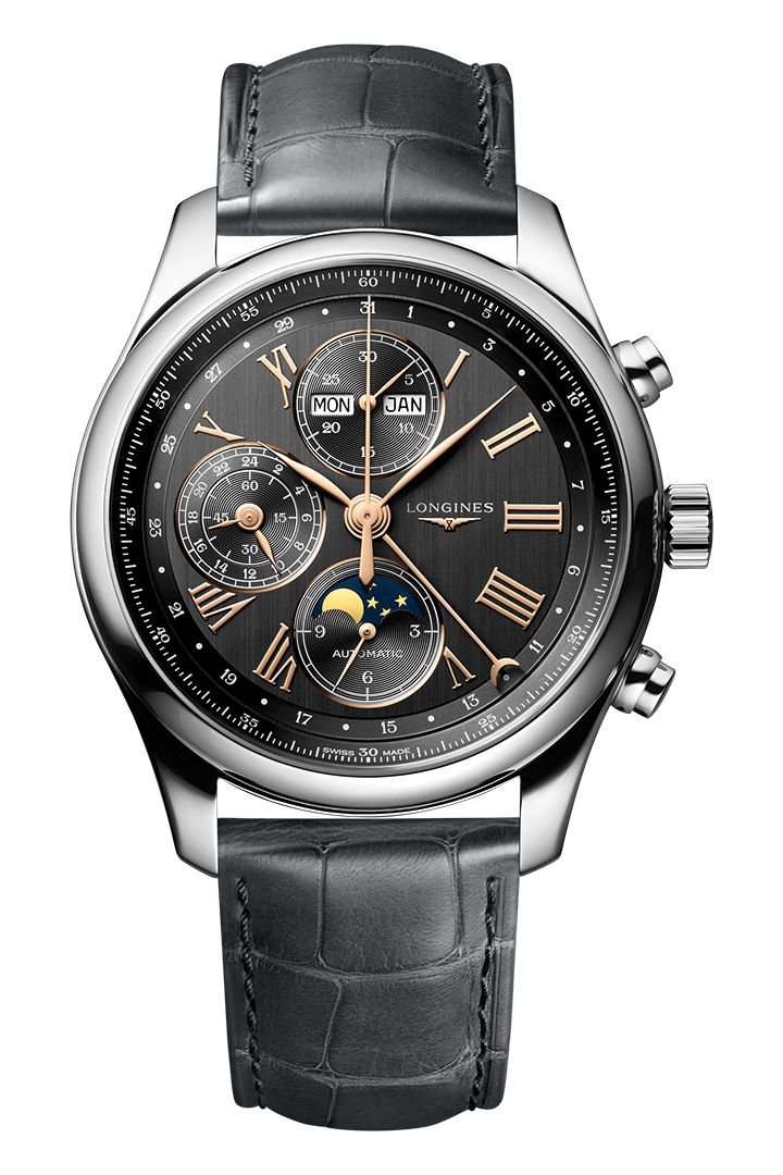 Luxusóra Longines Master Collection Automat, Holdfázisok, 42 mm. Az óra rendelkezik naptár, holdfázisok, stopper, dátumkijelző és Day-Date funkciókkal. Az óra alapvető paraméterei: a számlap színe szürke, a szerkezet típusa mechanikus kronográf automatikus felhúzással, a szíj anyaga bőr, vízállósága 30 m.