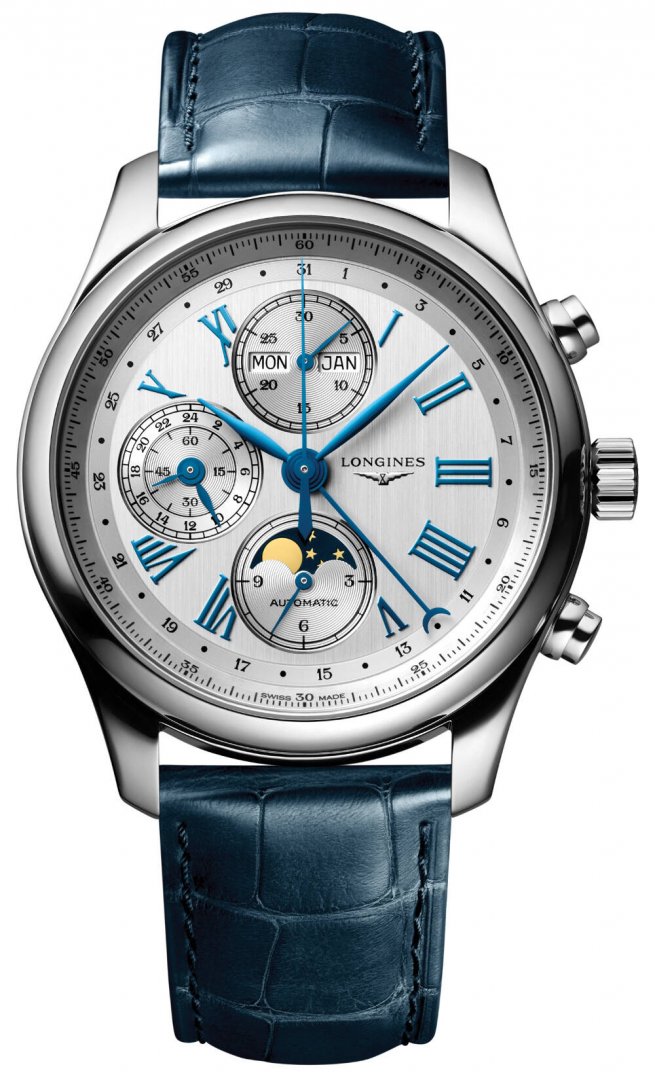Luxus órák Longines Master Collection Moonphase, Automatic, 42 mm. Az óra ezen funkciókkal rendelkezik: naptár, holdfázisok, stopper, adatmutató. Számlap színe: ezüst, szerkezet típusa: mechanikus kronográf automata felhúzással, szíj anyaga: bőr, vízállóság: 30 m.