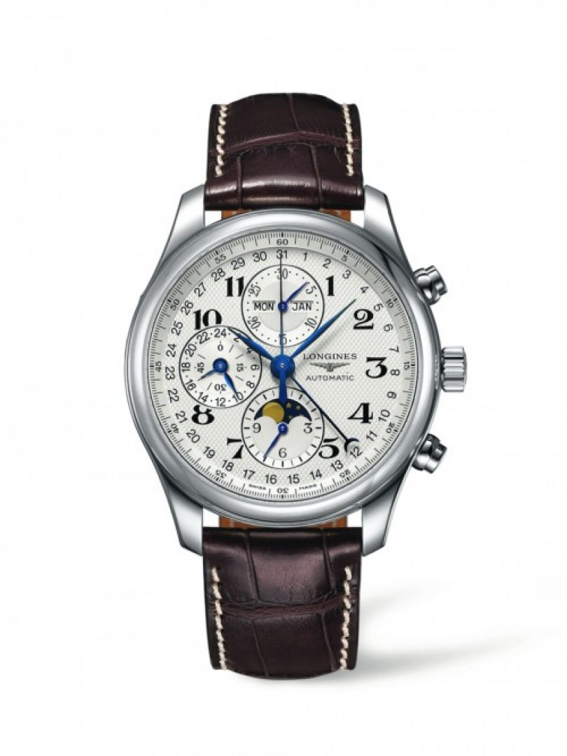 Luxus órák Longines Master Collection Moonphase, Automatic, 42 mm. Az óra ezen funkciókkal rendelkezik: naptár, holdfázisok, stopper, adatmutató. Számlap színe: ezüst, szerkezet típusa: mechanikus kronográf automata felhúzással, szíj anyaga: bőr, vízállóság: 30 m.