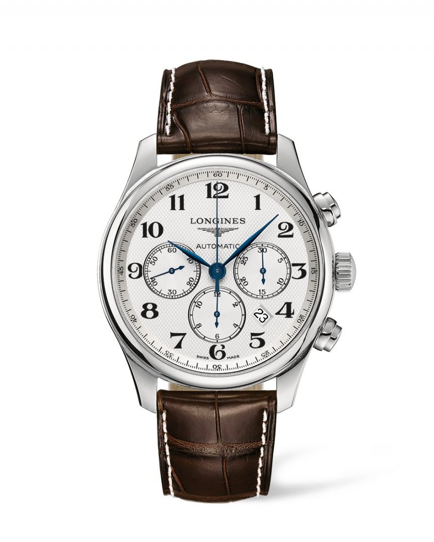Luxus órák Longines Master Collection Column-Wheel, Automatic Chronograph, 44 mm. Az óra ezen funkciókkal rendelkezik: adatmutató, stopper. Vízállóság: 30 m, számlap színe: bézs, szerkezet típusa: mechanikus kronográf automata felhúzással, szíj anyaga: bőr.