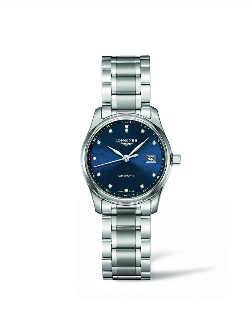 Luxus órák Longines Master Collection Diamonds, Automatic, 29 mm. Az óra ezen funkciókkal rendelkezik: adatmutató. Számlap színe: kék, szerkezet típusa: mechanikus óra automata felhúzással, szíj anyaga: acél, vízállóság: 30 m.