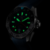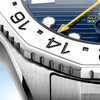 A GMT mutató, akárcsak az egyenletesen, szinte folyva mozgó másodpercmutató sárga lakkozást kapott, s a tengerkék számlap előtt ez valóban kontrasztos megjelenés remek leolvashatóságot biztosít. A svájci gyártású Super-LumiNova® bevonat a mutatókon és a nyolcszögletű indexeken rossz látási viszonyok, vagyis akár vízalatti merülés esetén is lehetővé teszi az idő leolvasását.