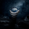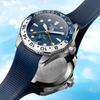 Rozsdamentes acél csattal vagy mélykék gumiszíjjal választhatjuk, mindkét esetben mikroállítási lehetőséget nyújt a dupla biztonsági áthajlózár. Az eredetileg búvárruhákhoz kifejlesztett megoldás a mindennapokban is hasznos lehet, amikor a közelgő hideg elől melegebb éghajlatra utazunk és gyorsan lazítani szeretnénk a szíj beállításán.