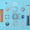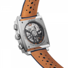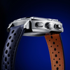A 39 milliméter átmérőjű és 100 méterig vízálló rozsdamentes acél óratokot lyuggatott kék színű borjúbőr szíjon csatolhatjuk csuklónkra, amely narancssárga varrást és polírozott dupla biztonsági áthajlózárat kapott.