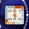 A napsugaras csiszolású kék számlapon feltűnő két segédszámlap a stopperhez tartozik, és a jobb oldali percgyűjtőn visszaköszönnek a Gulf színei, míg a másik oldalon 12 órás mérésig használható gyűjtő látható.