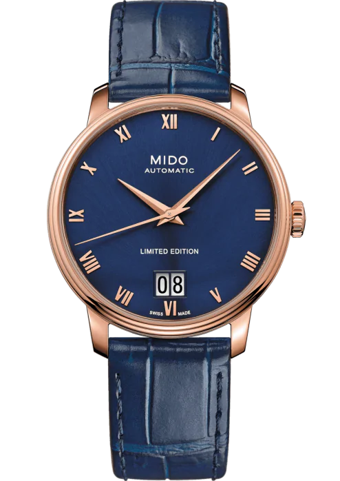 Egy kivételes óra limitált példányszámban, kezdve a csodálatos mélykék napsugárzású, szaténozott számlapjával, amely teljesen elbűvölő. A 6 óránál a Big Date jellegzetessége: a széles, csiszolt és homokfúvott dátumnyílás, amely az egyik legnagyobb a piacon ebben az árkategóriában. A Baroncelli Big Date Limited Edition számlapját egy elegáns, kerek, polírozott acélból készült tok védi, amelyet egy dupla gadronozott lünetta egészít ki, és mindkettő rózsaarany színű PVD-kezeléssel van ellátva. Ez a kiváló időmérő valódi marhabőrből készült, kék krokodil kinézetű szíjjal van ellátva, és egy csúcstechnológiás automata óraművel van felszerelve. Az eredeti dátumkijelző mellett a nagy dátumnyílással ellátott Caliber 80 félelmetes autonómiát kínál, akár 80 órás járástartalékkal.