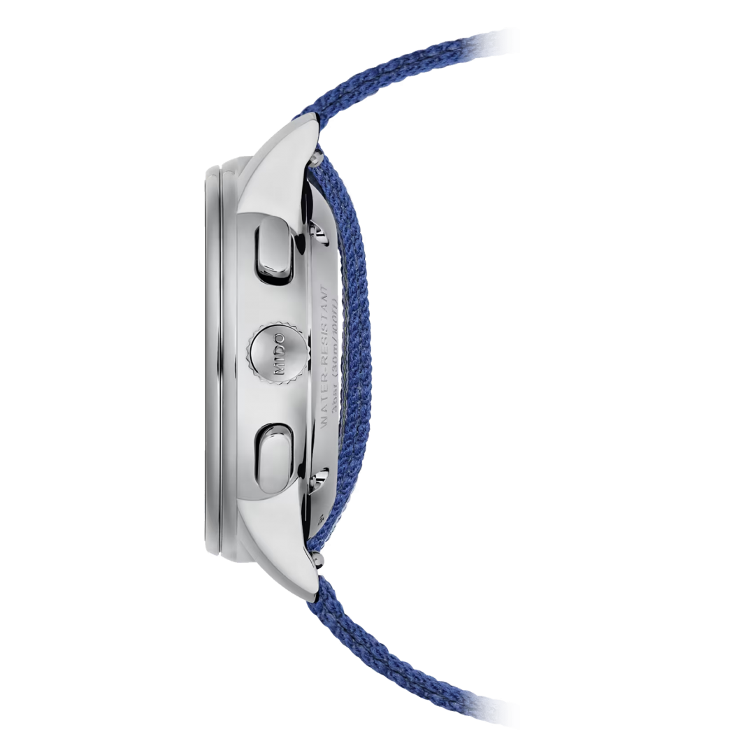 Férfi órák svájci órák luxus karórák webshopja Mido Baroncelli CHRONOGRAPH MOONPHASE 42mm acél tok textil szíj. Az óra ezen funkciókkal rendelkezik: naptár, stopper, Day-Date, holdfázis. Számlap színe: fehér, szerkezet típusa: mechanikus kronográf automata felhúzással, szíj anyaga: bőr, vízállóság: 50 m.