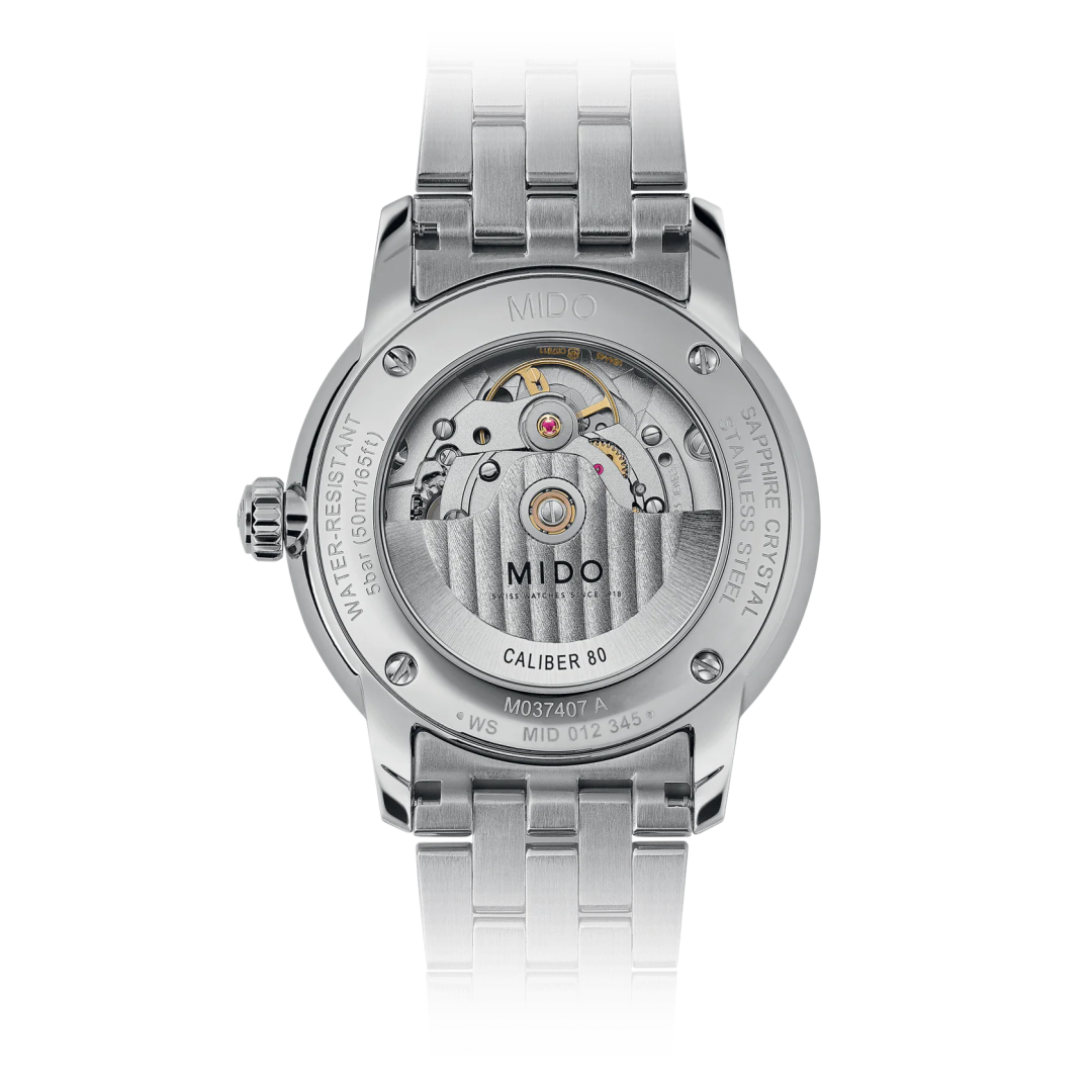 A párként tervezett Baroncelli Heritage svájci órákat könnyűségük, karcsúságuk és rendkívül tiszta vonalvezetésük különbözteti meg, amelyet a kétoldalas mutatók és a dupla gadroon biztosítanak. Ezek a klasszikus és időtálló, automata szerkezetű órák a Mido szakértelmének tökéletes kifejeződései.