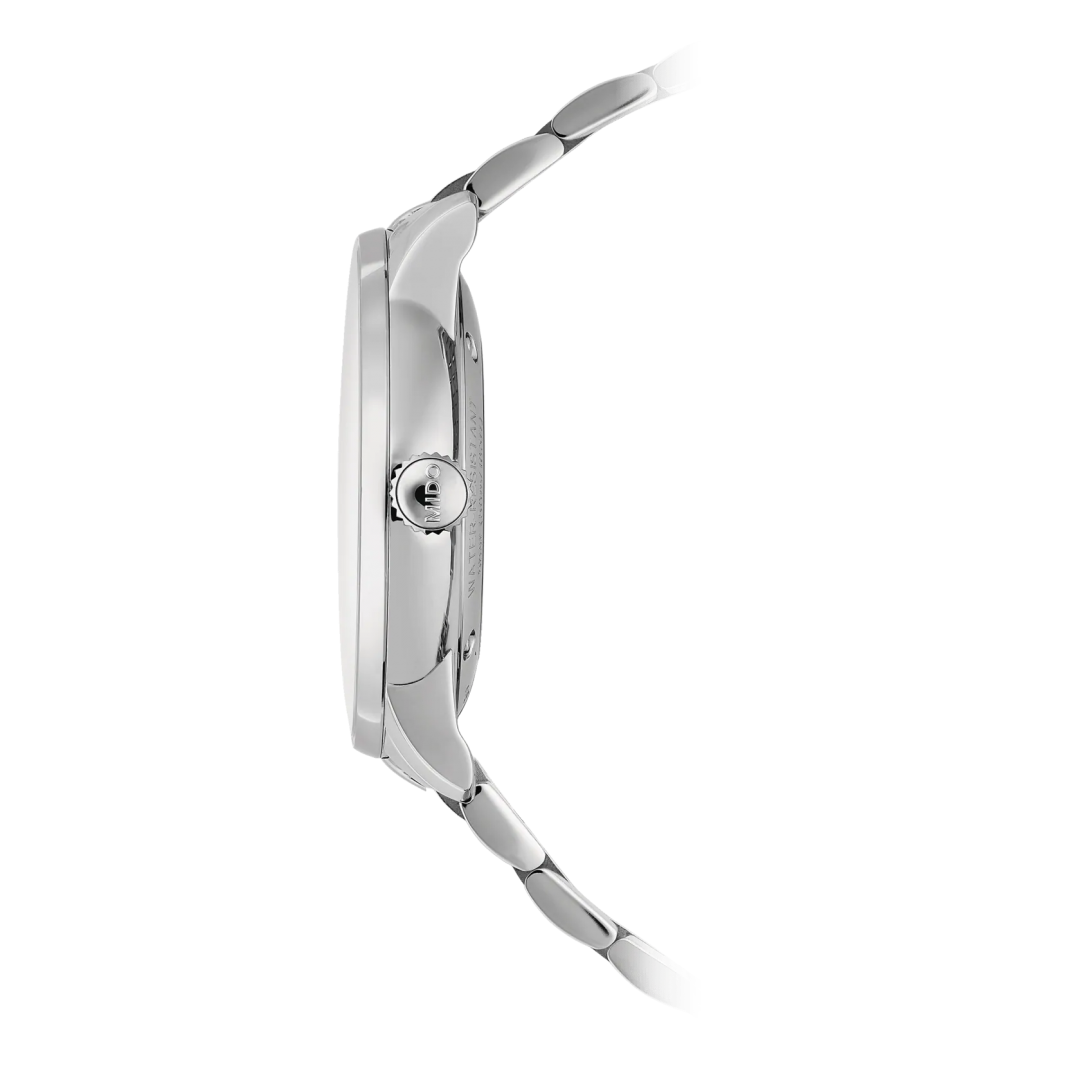 Női karórák luxus órák luxus karórák webshopja Mido Baroncelli Signature 39mm automata acél acél csat. Az óra ezen funkciókkal rendelkezik: naptár. Szerkezet típusa: mechanikus óra automata felhúzással, vízállóság: 50 m, számlap színe: ezüst, szíj anyaga: acél.