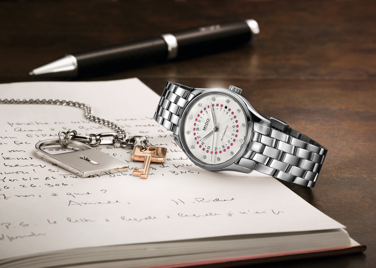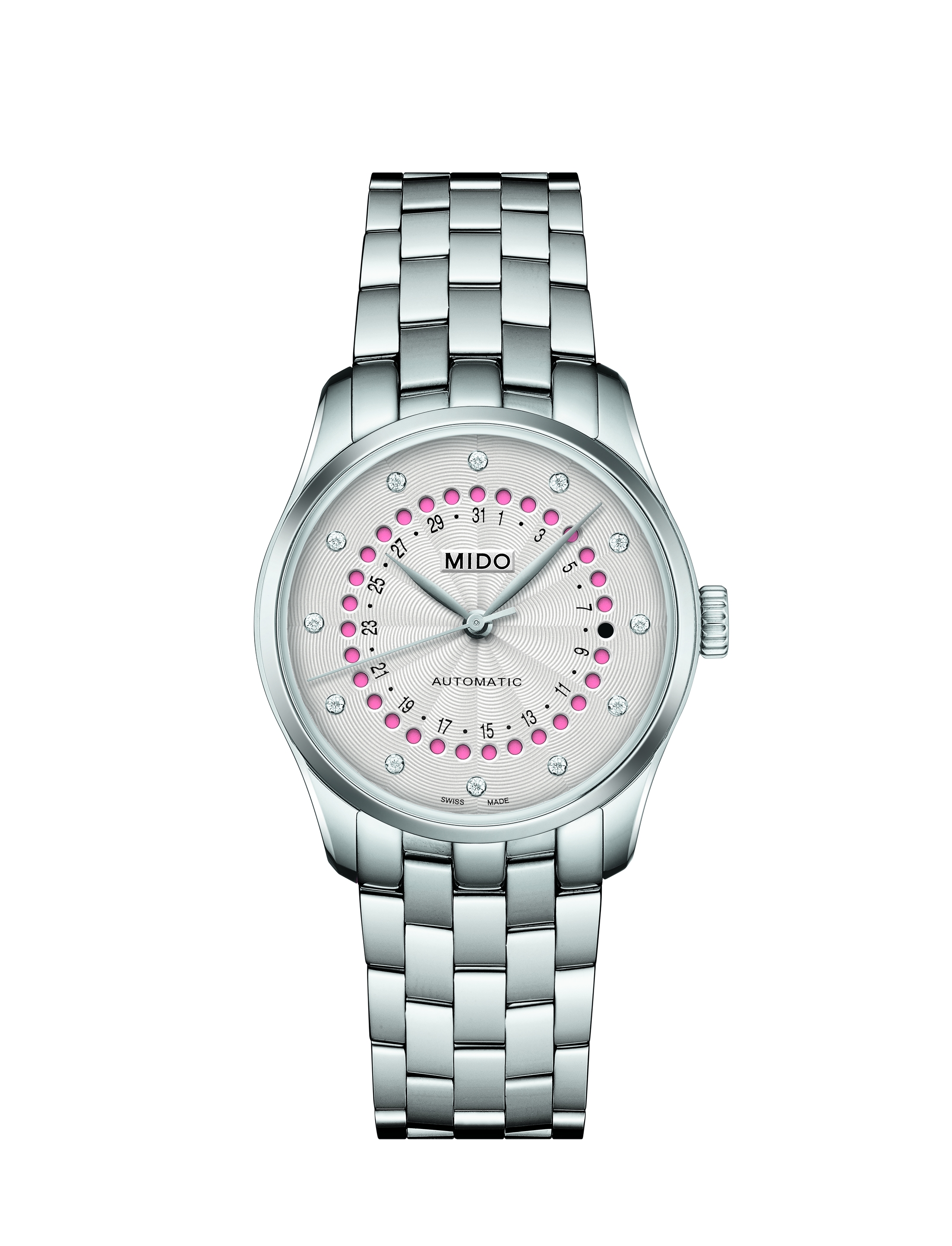 A Mido a romantikát ünnepli az új Belluna Mysterious Date kiadással. A női órát egy csodálatos ezüstözött, hullámos, guilloché stílusú számlap díszíti, amelynek közepén a Le Locle-i székhelyű óragyártó által korábban még soha nem használt dátumkijelző található. A napok múlása a 31 nyílással ellátott áttört számlapon keresztül látható: a dátum fekete színnel, míg a naptár többi napja rózsaszínnel jelenik meg. Ezt a finom és színes, az óragyártásban ritkán előforduló kijelzést a számlap felületén körben elhelyezett tizenkét gyémánt lenyűgöző ragyogása fokozza. Ez a finoman megmunkált külső egy legújabb generációs automata óraműnek ad otthont: a Caliber 80-nak, amely kivételes, akár 80 órás járástartalékot biztosít a modellnek. A titokzatosság aurájával átitatott Belluna Mysterious Date a titkos randevúk elengedhetetlen kelléke...