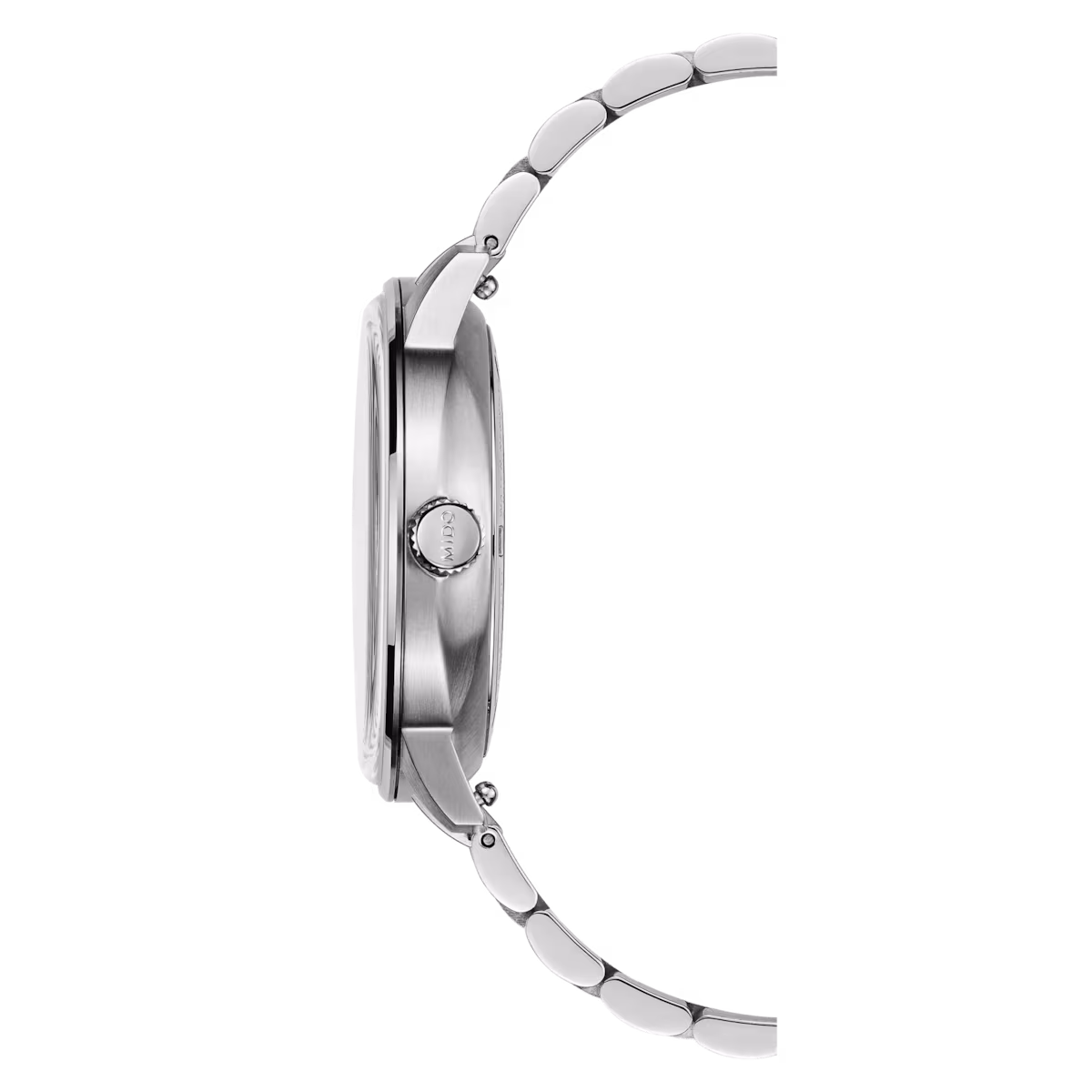 A MIDO Commander Datoday a márka egyik legikonikusabb sorozatának modern folytatása. A Commander kollekció 1959-ben jött létre, és azóta megőrizte jellegzetes formatervezési nyelvét – integrált koronát, tiszta vonalakat és elegáns „glassbox” profilt. Ez a kék sunray számlappal ellátott változat ötvözi a kortalan esztétikát a modern technológiával, beleértve a Caliber 80 óraművet és a Nivachron™ hajszálat.