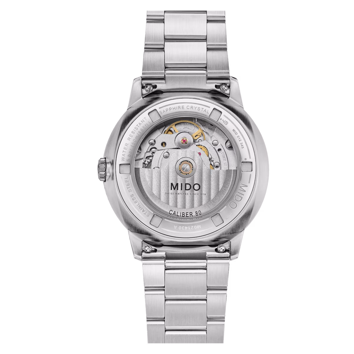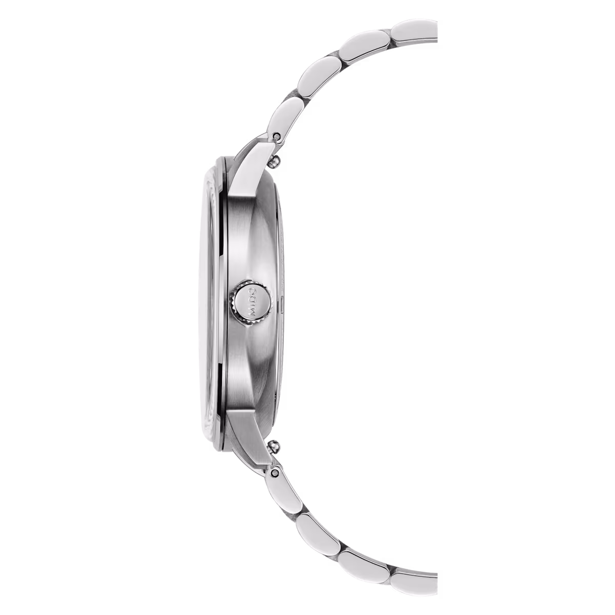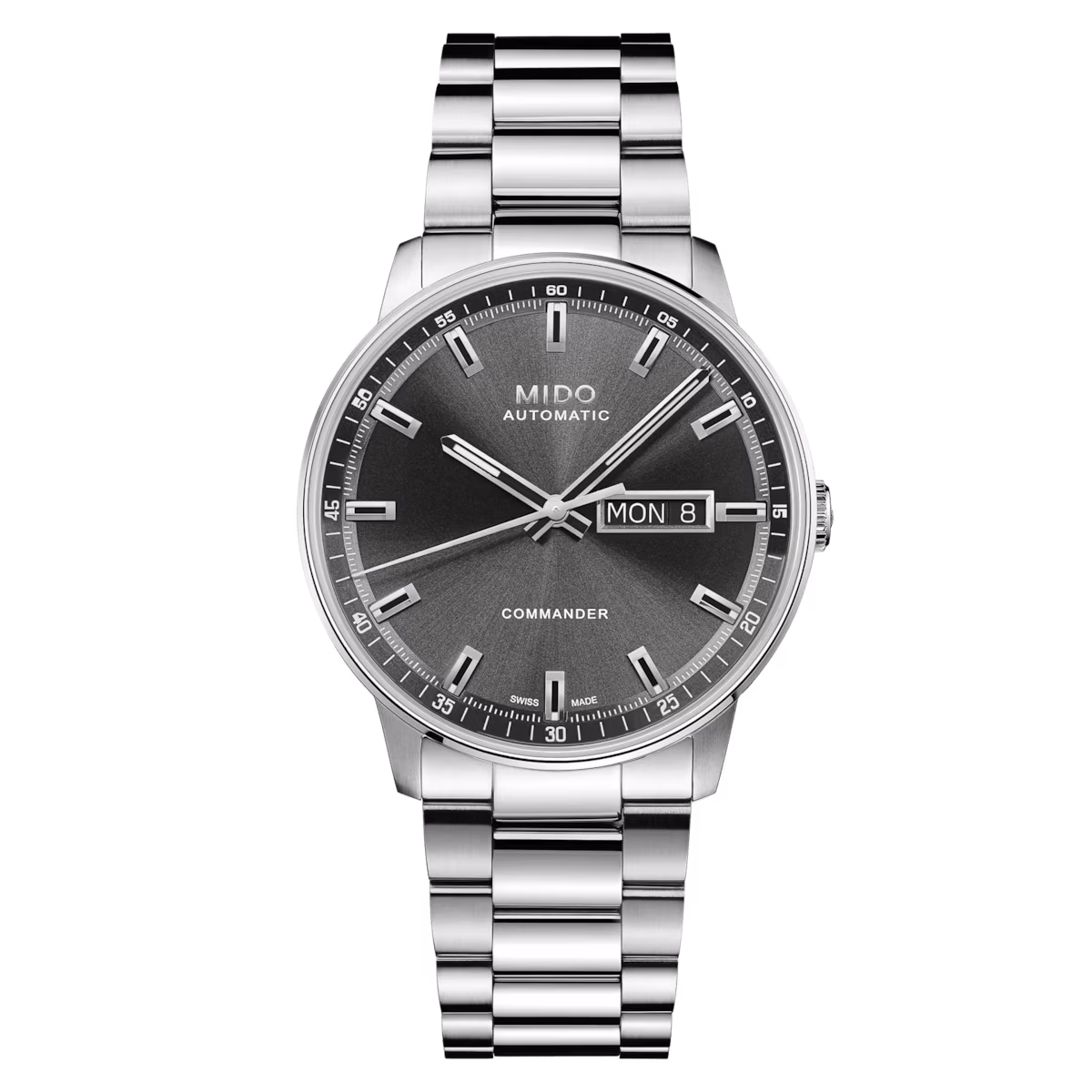 A MIDO Commander Datoday a márka egyik legikonikusabb modelljének modern interpretációja. Több mint 60 éve a Commander a letisztult design, az építészeti esztétika és a műszaki megbízhatóság ötvözetét képviseli. Ez az acél kivitelű, antracit színű számlappal ellátott változat megőrzi a kollekció összes jellegzetes elemét – az integrált koronát, a glassbox zafír üveget és az elegáns arányokat –, miközben modern Caliber 80 óraművet tartalmaz 80 órás gangtartalommal és Nivachron™ hajszállal.