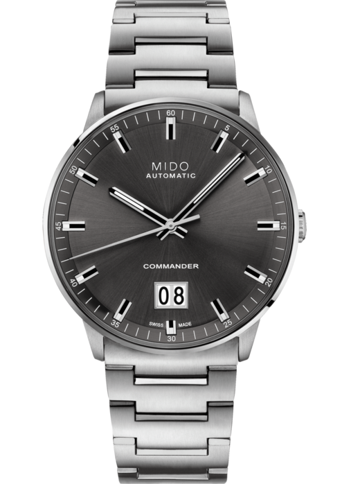 Luxusné hodinky Mido Commander Big Date Automat, 42 mm. Hodinky disponujú funkciami ukazovateľ dátumu a luminiscencia. Základné parametre hodín sú: typ strojčeka je mechanické hodinky s automatickým náťahom, materiál remienka je oceľ, vode odolnosť je 50 m a farba ciferníka je šedá.