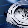 Mido Multifort 8 Two Crowns matt kék számlappal és kék gumiszíjjal, a képen az óra átlátszó hátlapja látható, modellszám: M047.507.17.041.00