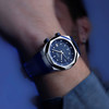 Mido Multifort 8 Two Crowns matt kék számlappal és kék gumiszíjjal, a képen a belső forgatható karima látható, modellszám: M047.507.17.041.00