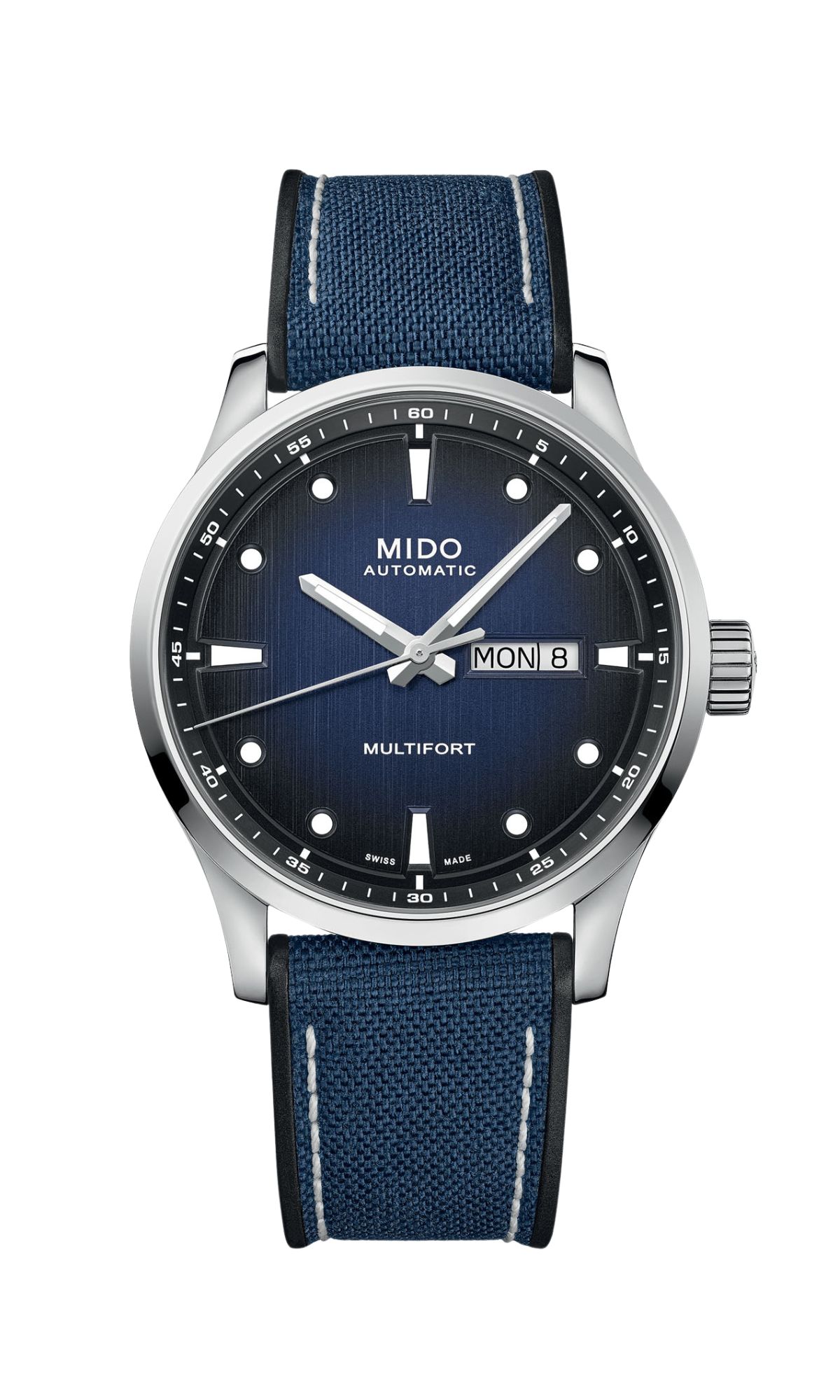 A Multifort M színátmenetes számlapján a függőleges selyemfényű csiszolás a kollekcióra jellemző Côtes de Genève díszítés alapján készült. A tiszta fényű Super-LumiNova® a mutatókon és a kerek indexeken jó kontrasztot és leolvashatóságot teremt. A Multifort legendás robusztussága a híres Caliber 80 mechanikus óraszerkezet ritmusát követi. Az akár 80 órás járástartalékot a Nivachron™ - egy forradalmi anyagból készült, félelmetes pontosságot kínáló - hajszálrugóval kombinálják. A MIDO a Multifort M-et egyszerű szíjcsere-rendszerrel kínálja, acél vagy textil borítású gumi változatban.